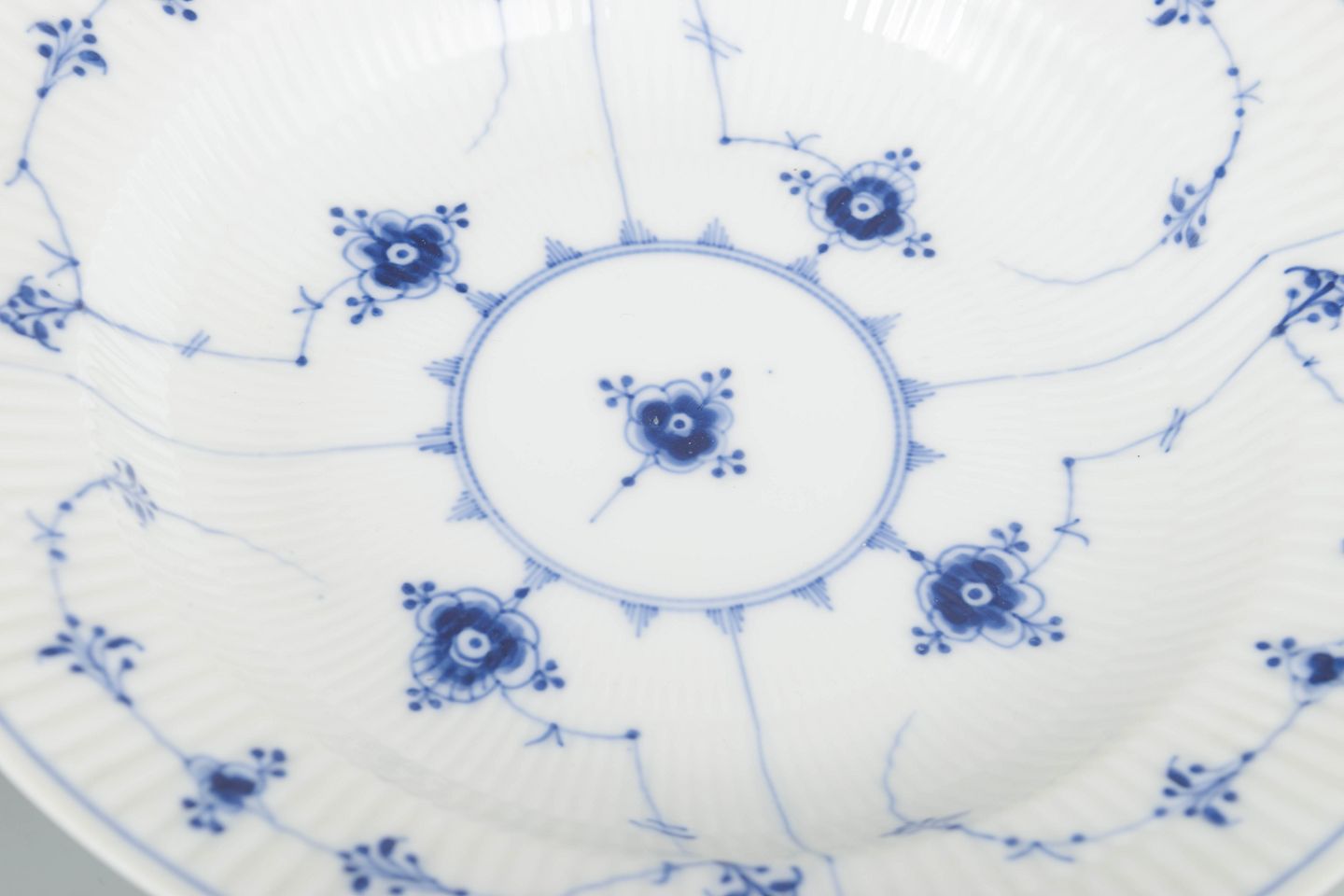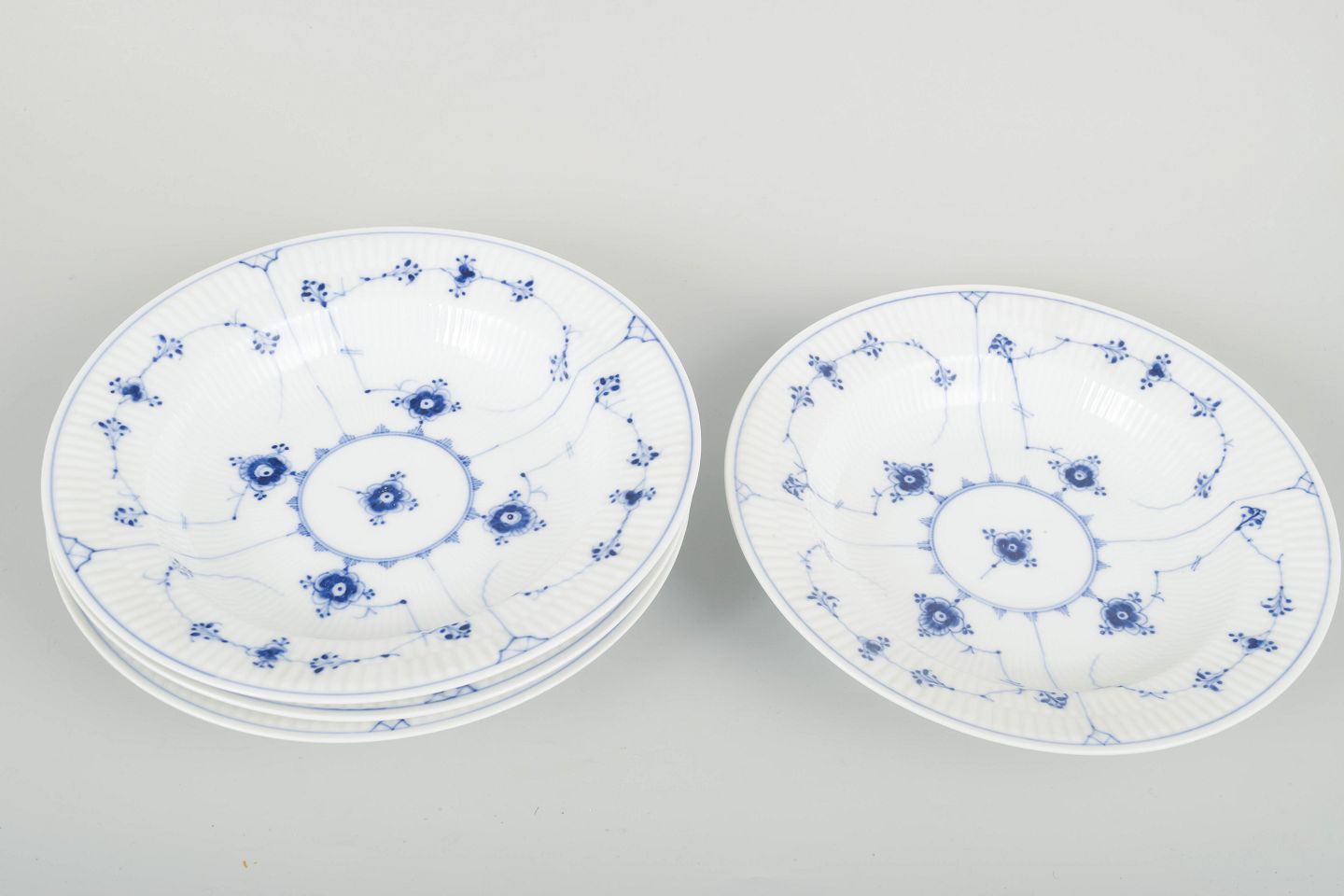 Set of four deep plates in classic “Blue Fluted” porcelain with hand-painted blue decoration and fluted body. A refined and early 20th-century example of Royal Copenhagen craftsmanship.