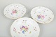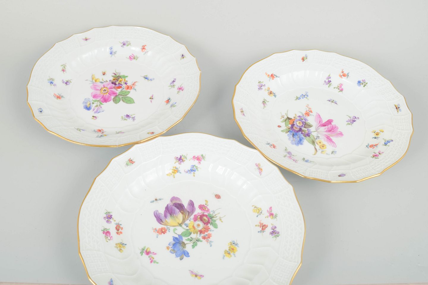 Elegant sæt håndmalede tallerkener i hvidt porcelæn med farverige blomsterbuketter, små spredte blomster og profil­eret reliefkant med guldbort. Klassisk Meissen-arbejde af høj kvalitet.