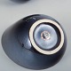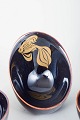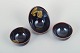 Three small hand-glazed bowls in deep blue glaze, one decorated with an elegant gold-coloured fish motif. A classic example of Gustavsberg craftsmanship in miniature scale.