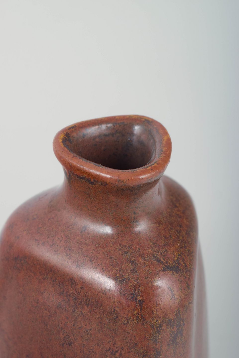 Håndlavet stentøjsvase i karakteristisk triangulær form med blød, afrundet geometri. Udført i en dyb rødbrun reduktionsglasur, som fremhæver værkstedets raffinerede overfladespil og stramme formsprog.