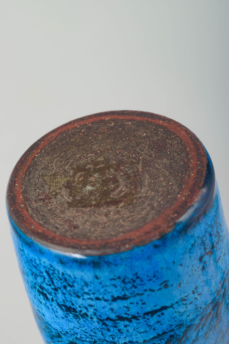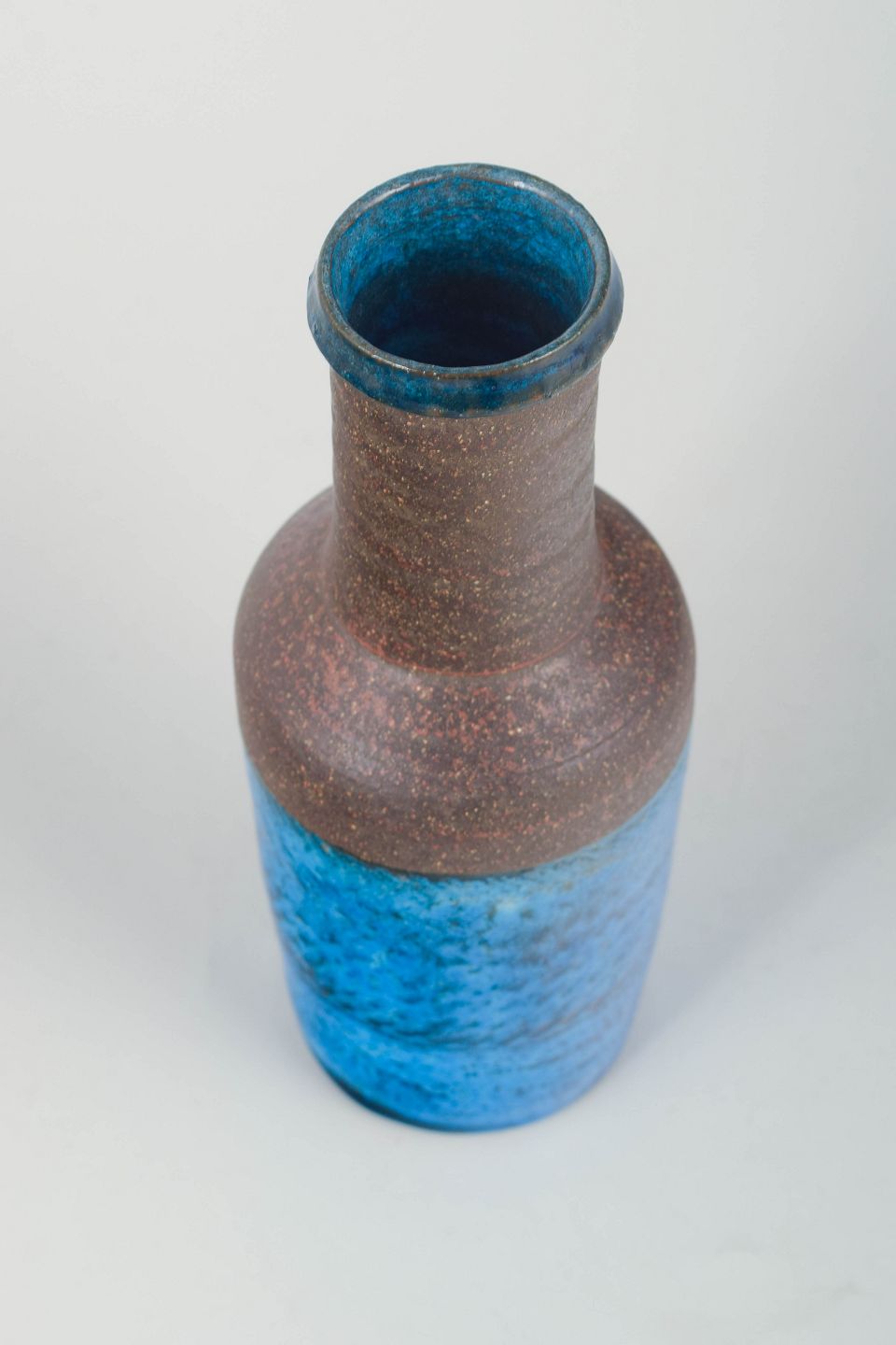 Høj cylindrisk vase med en markant todelt glasurtypologi: den øverste del i rå, ubrændt brunlig stentøjstekstur og den nederste del i en dyb, levende azurblå glasur. Kontrasten mellem de to overflader giver vasen et skulpturelt og moderne udtryk, typisk for Nils Kählers arbejde i 1960’erne.