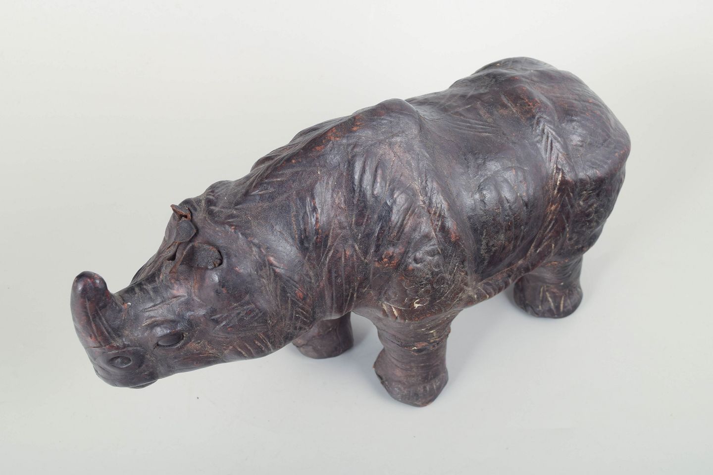 Håndlavet figur af et næsehorn udført i formet og syet læder, muligvis solgt gennem Liberty & Co., London. Figuren har flot modellerede detaljer og en naturlig patina, der fremhæver det håndværksmæssige udtryk.