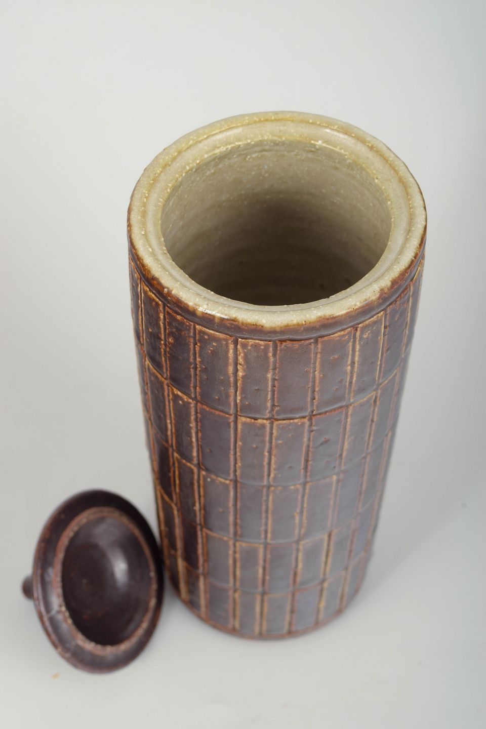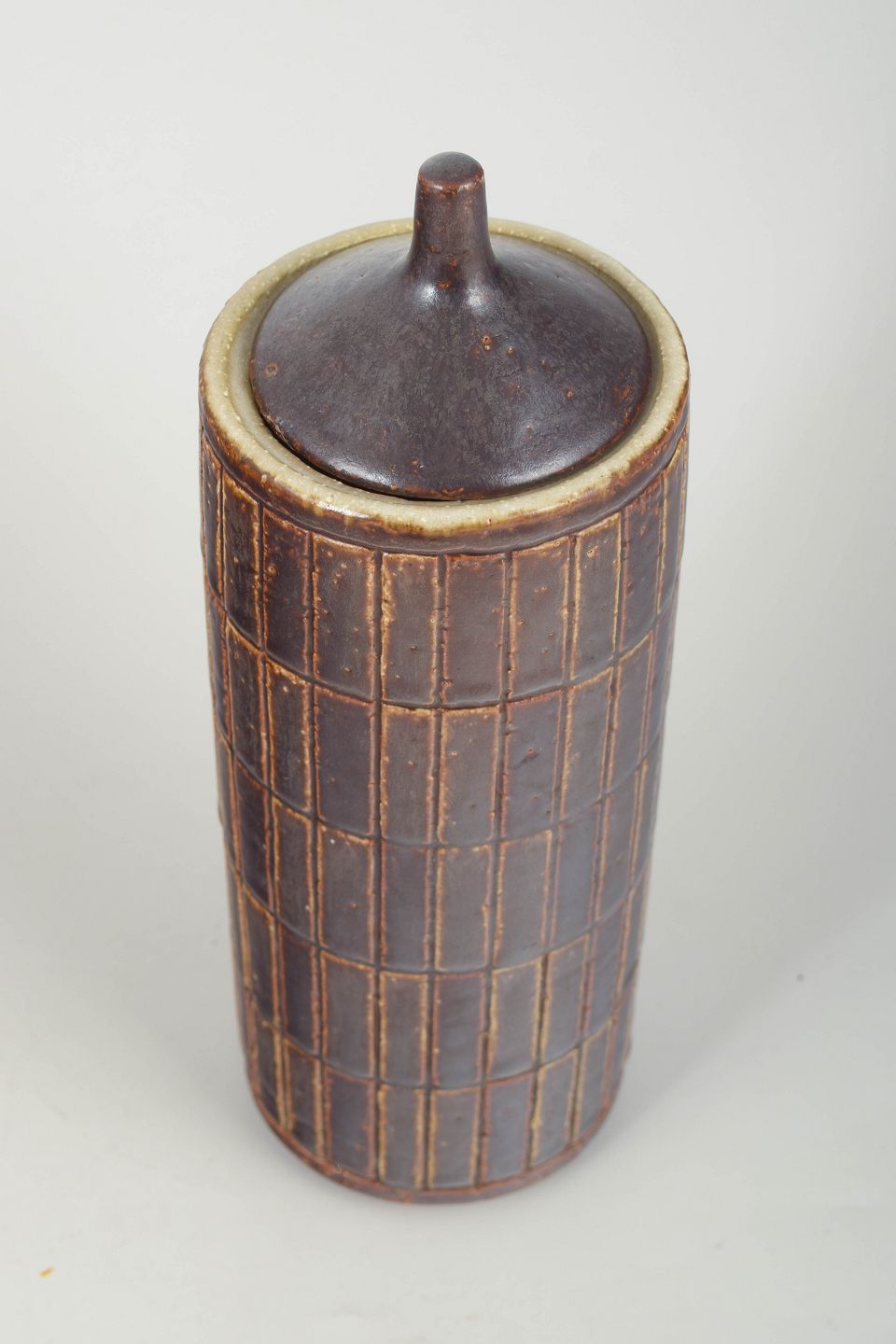 Tall cylindrical stoneware vase with fixed conical lid, executed in the characteristic brown Palshus glaze with vertical and horizontal relief lines. A striking example of the workshop’s refined modernist aesthetic.