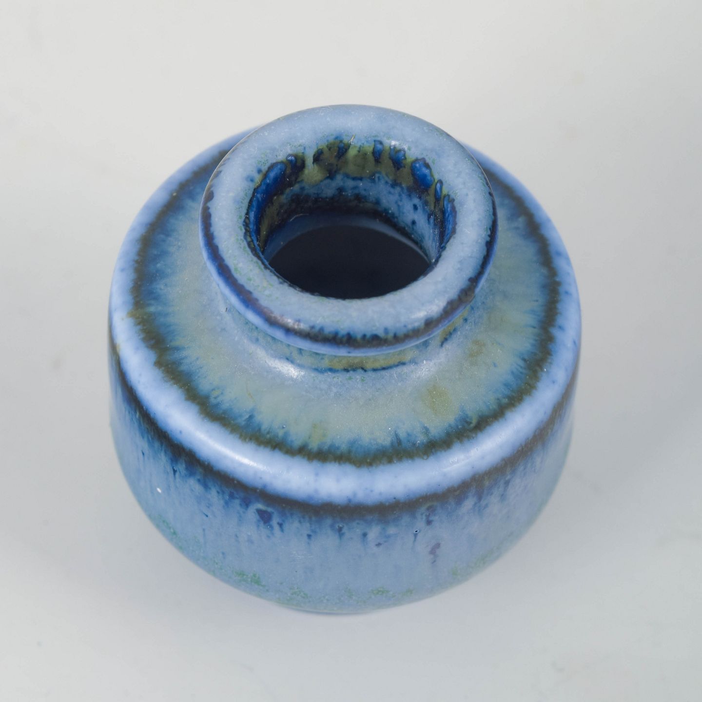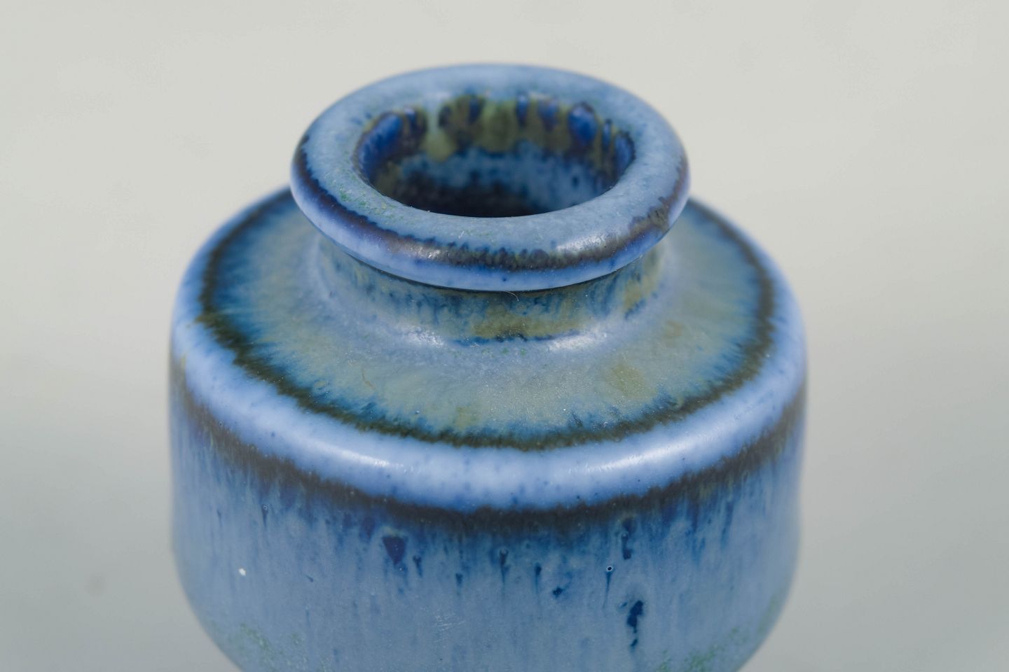 Small miniature vase in glazed stoneware with a compact cylindrical form and a nuanced blue-green running glaze.