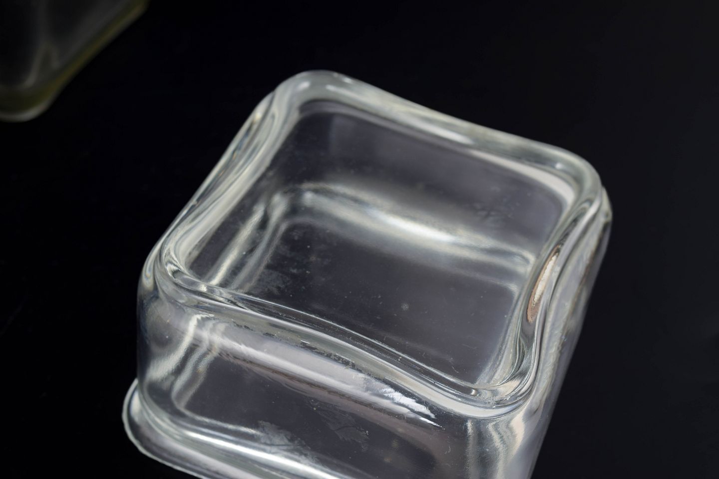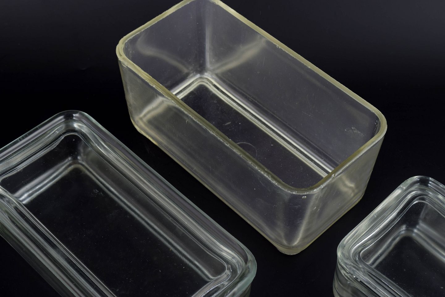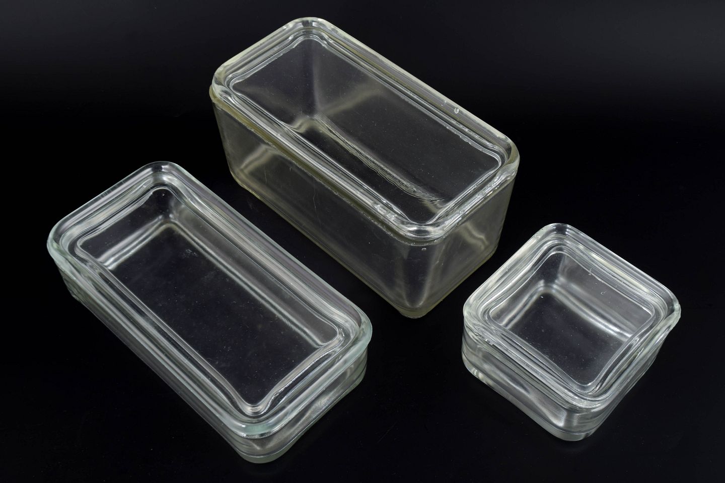 Sæt af tre rektangulære opbevaringsbokse i klart glas fra Wilhelm Wagenfelds ikoniske “Kubus”-serie. Serien forener funktionalistisk Bauhaus-æstetik med enkle proportioner og høj brugsværdi. Højdeinterval 5–9 cm, længde 8–18 cm.