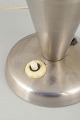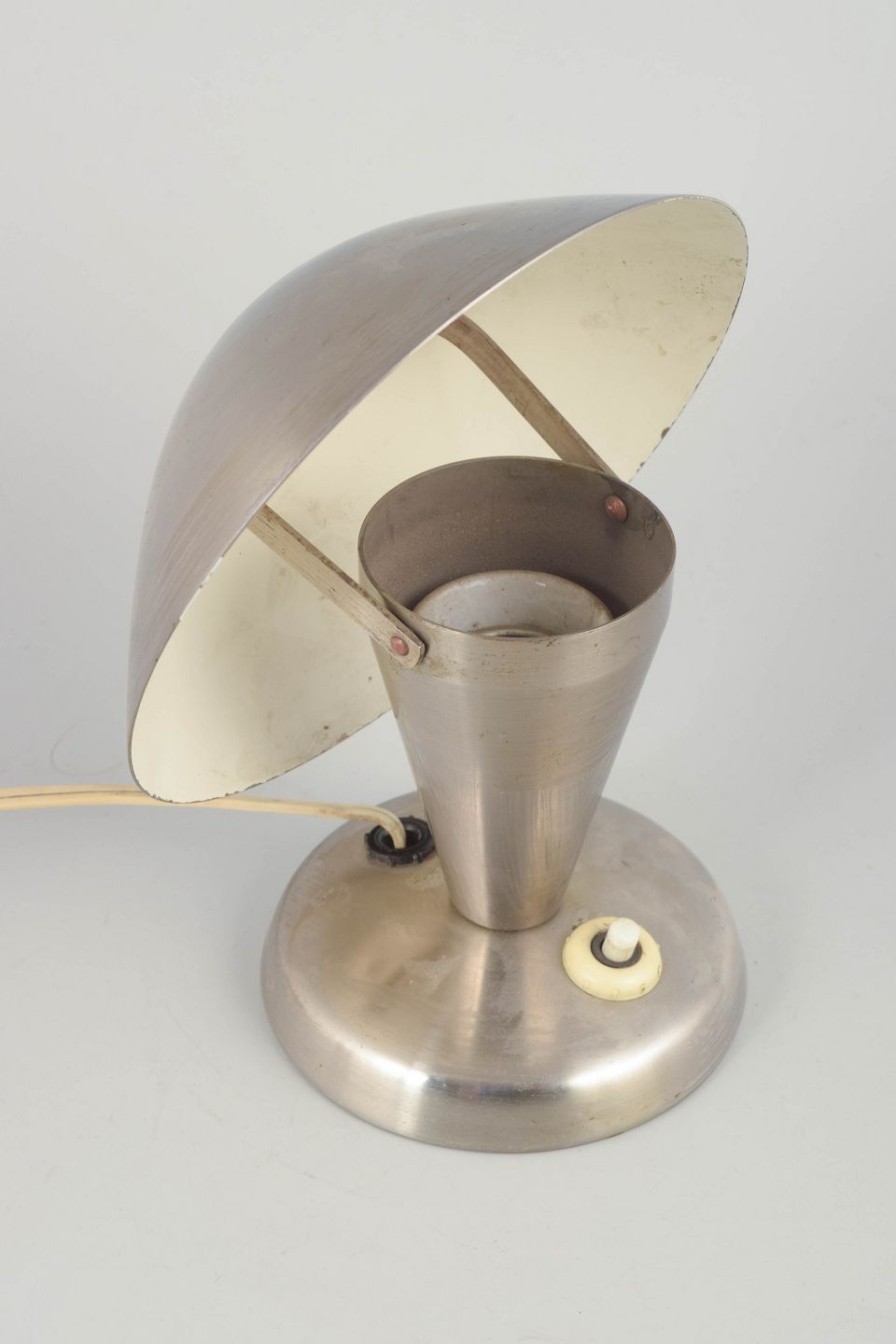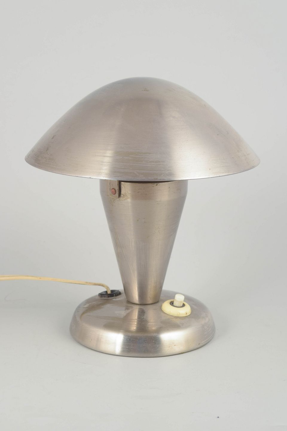 Early modernist table lamp in brushed steel with a mushroom-shaped shade and conical base. A characteristic example of Czech functionalist lighting design from the interwar period, defined by clean lines and industrial materials.