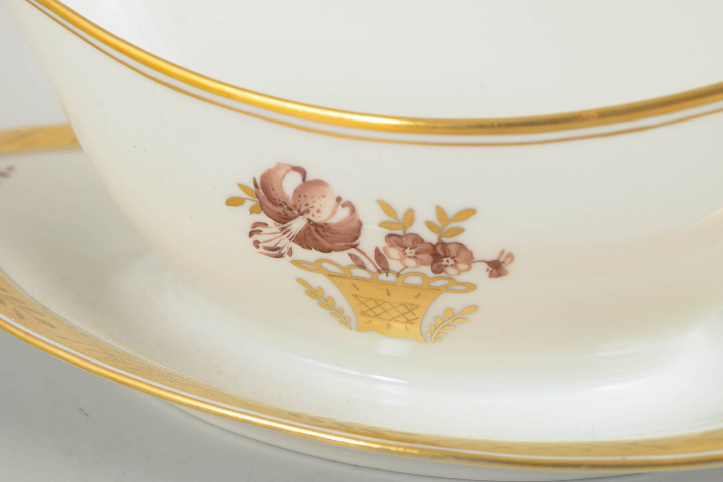 Elegant porcelain sauce boat from Royal Copenhagen’s “Golden Basket” series, model 595/9344. Features an attached underplate, gilded rim and the classic hand-painted floral basket motif.