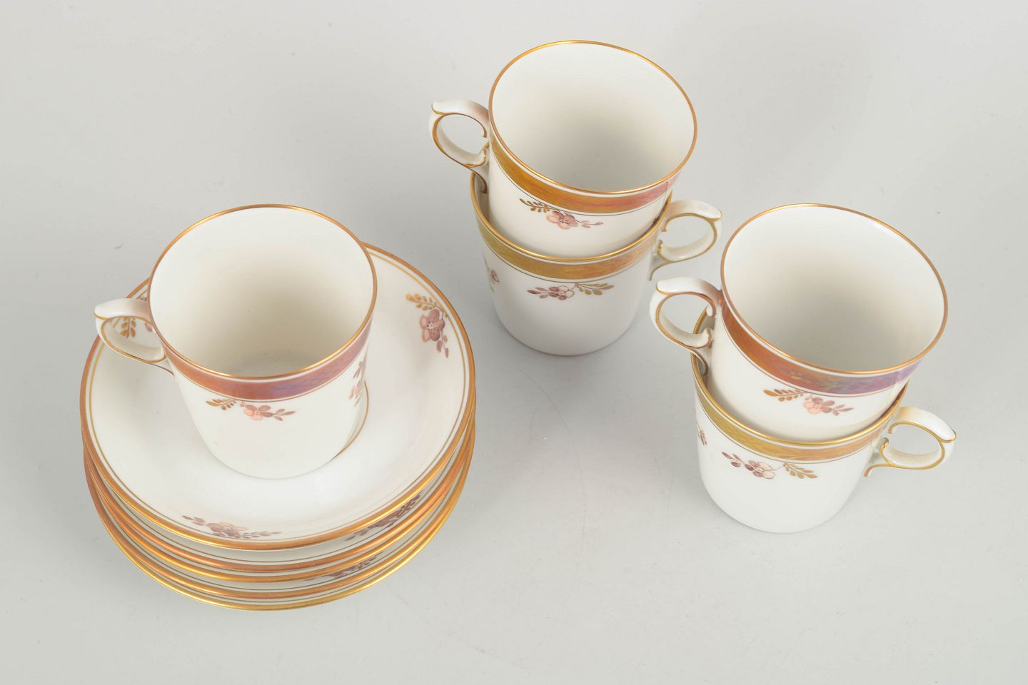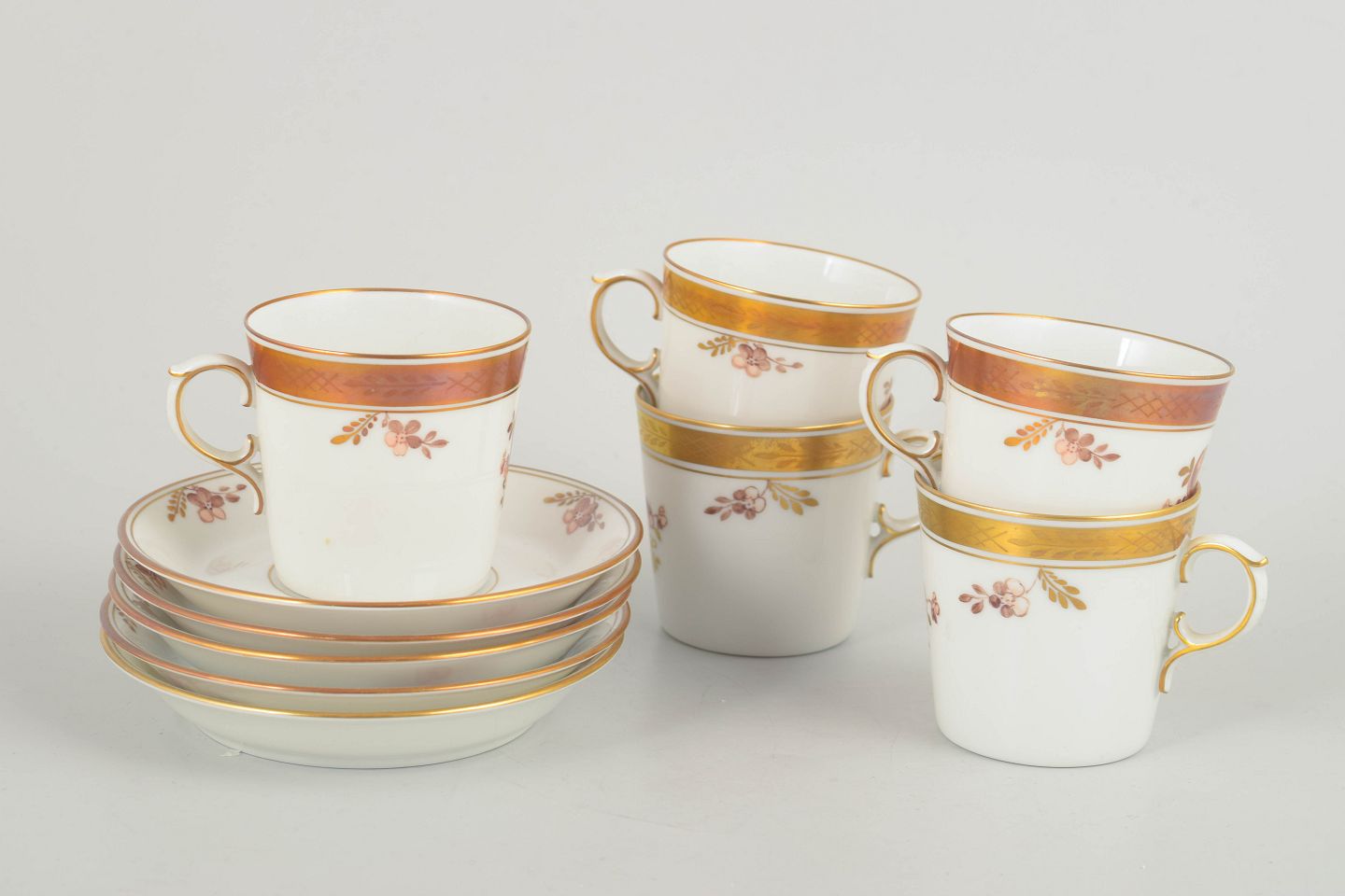 Smukt sæt bestående af fem mokkakopper med tilhørende underkopper fra Royal Copenhagens “Guldkurv”-serie, model 595/9093. Elegant udført i porcelæn med forgyldte kanter og håndmalede blomsterdekorationer.