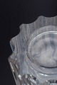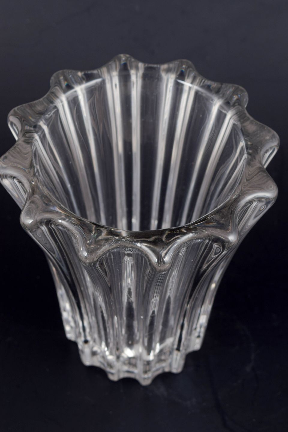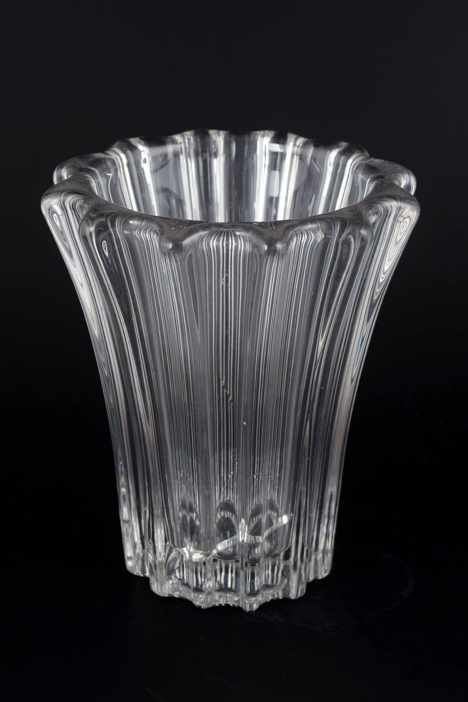 Art deco clear glass vase with pronounced vertical ribbing and a softly scalloped rim, executed in the recognisable style associated with Pierre d’Avesn’s decorative glass designs. The structured surface combined with the organic top creates an elegant, sculptural presence.