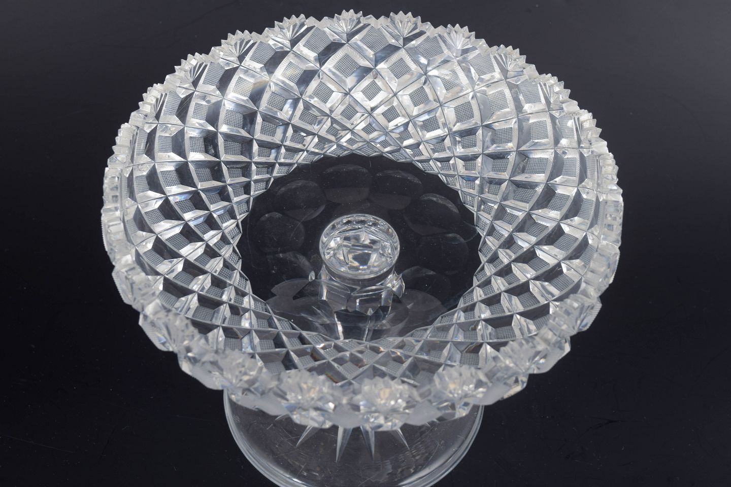 Elegant faceted compote in clear crystal glass with star-patterned rim and a shaped, faceted stem. A classic example of the decorative glasswork of the period, where geometry and light reflection are key design elements.