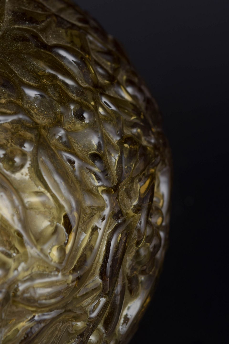 Decorative, mouth-blown vase in amber-coloured glass with deeply moulded relief featuring leaves and berries. The organic ornamentation and warm tone are characteristic of French art glass from the mid-20th century.