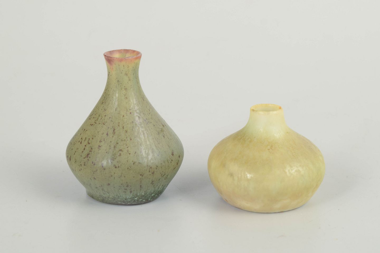 To elegante miniaturevaser i stentøj, begge med karakteristiske, bløde organiske former og subtile matte glasurer. Den ene i grønligt skær med rosa tone ved halsen, den anden i lysegule nuancer med fint spil i overfladen – typisk for Stålhane’s eksperimenterende glasurarbejde.