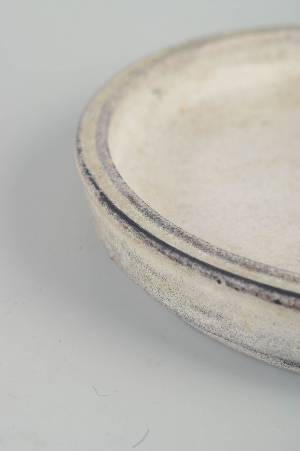 Lav, cirkulær skål udført i stentøj med enkel, arkitektonisk form og diskret profileret kant. Den lyse, afdæmpede glasur i creme- og sandtoner understreger Svend Hammershøis karakteristiske fokus på proportion, overflade og stoflighed. Et klassisk eksempel på Kählers funktionelle og tidløse formsprog fra mellemkrigstiden.
