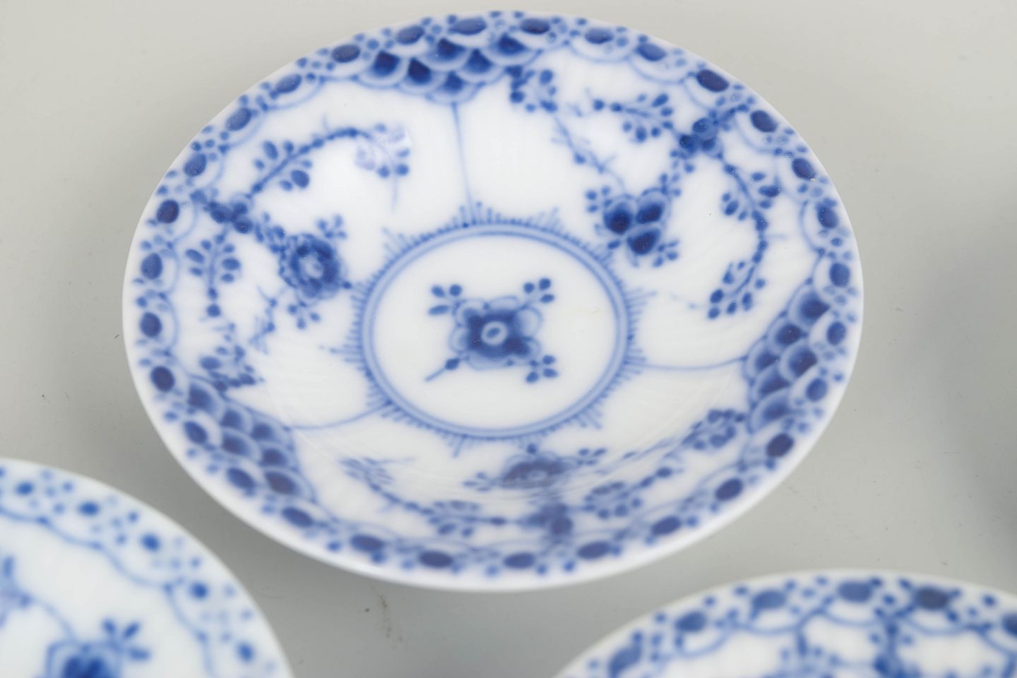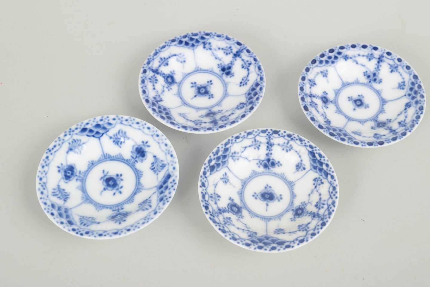 Sæt bestående af fire kaviarfade i Musselmalet halvblonde. Skålene er udført i riflede former med blondekant og håndmalet koboltblå dekoration. En tidlig og raffineret serveringsform, oprindeligt anvendt til kaviar og andre delikatesser.
