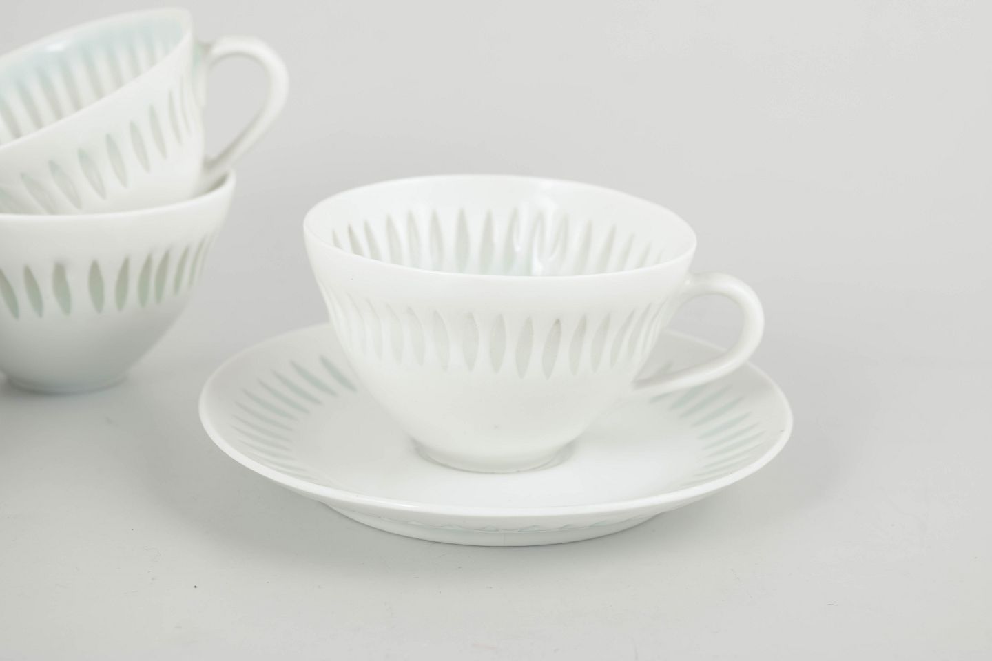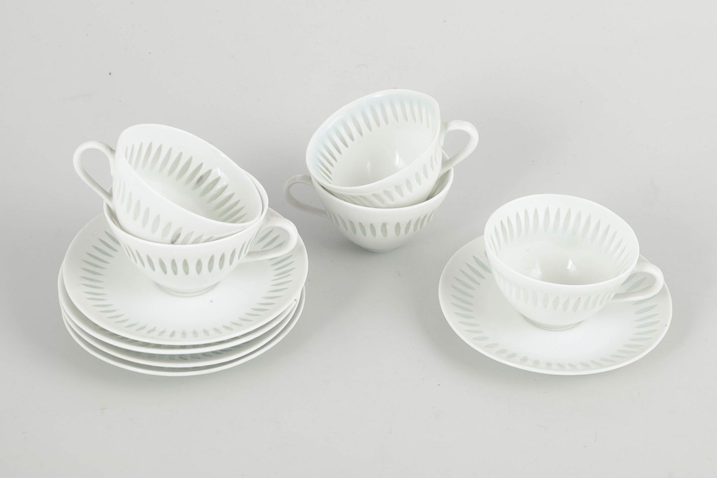Større sæt bestående af fem mokkakopper med tilhørende underkopper i hvidt porcelæn med gennembrudt “rice porcelain”-dekoration. De fine, aflange perforeringer udfyldt med transparent glasur giver porcelænet et let, næsten translucent udtryk. De enkle, harmoniske former er karakteristiske for Friedl Holzer-Kjellbergs sene modernistiske design for Arabia.