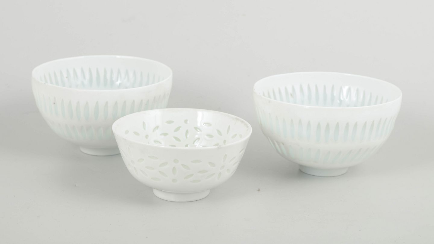Sæt bestående af tre små skåle i hvidt porcelæn med gennembrudt og præget dekoration i klassisk “rice porcelain”-udtryk. De fine perforeringer og transparente glasurfelter giver skålene et let og næsten translucent præg, mens de enkle, koniske former understreger Friedl Holzer-Kjellbergs raffinerede modernistiske formsprog.