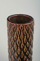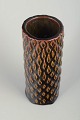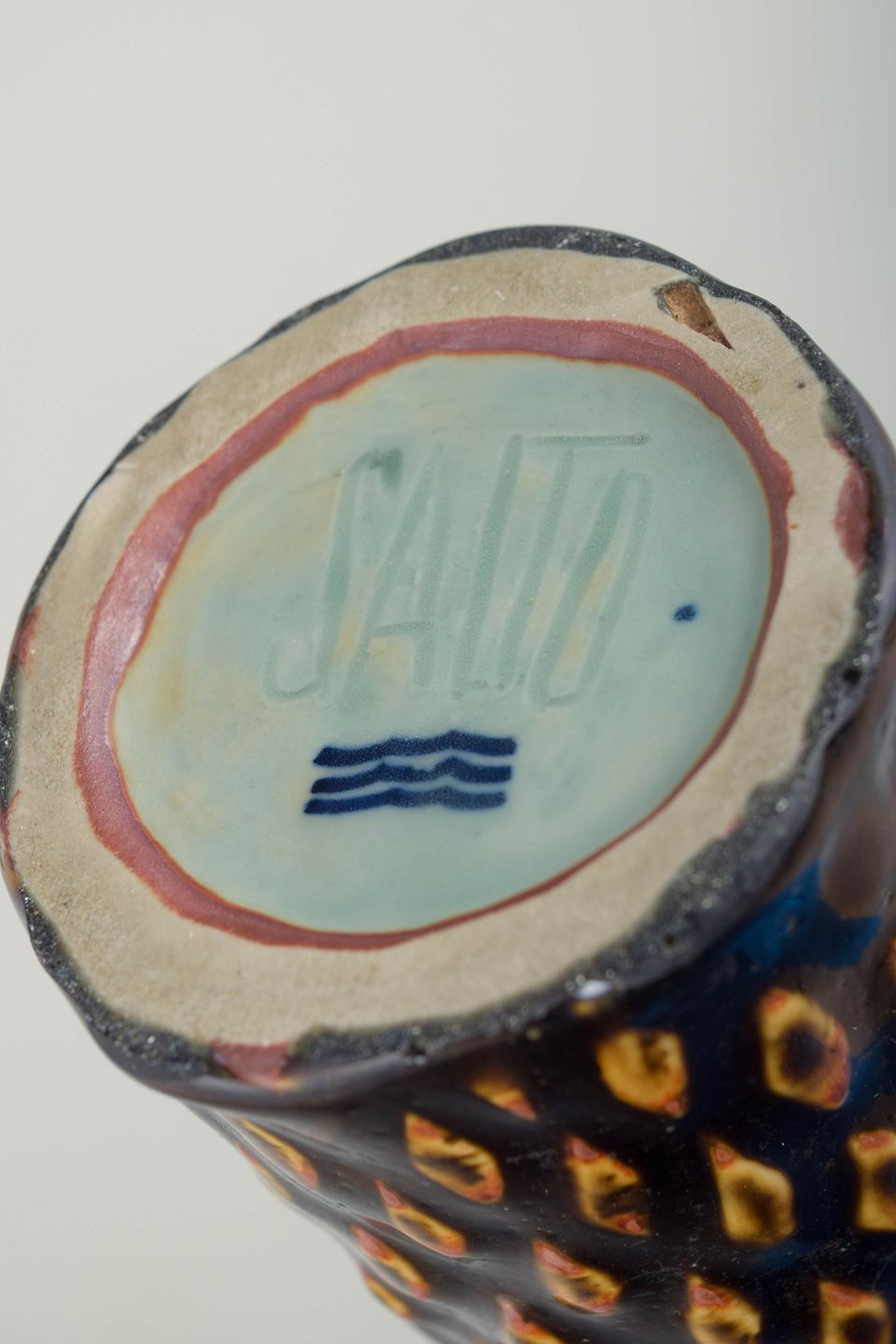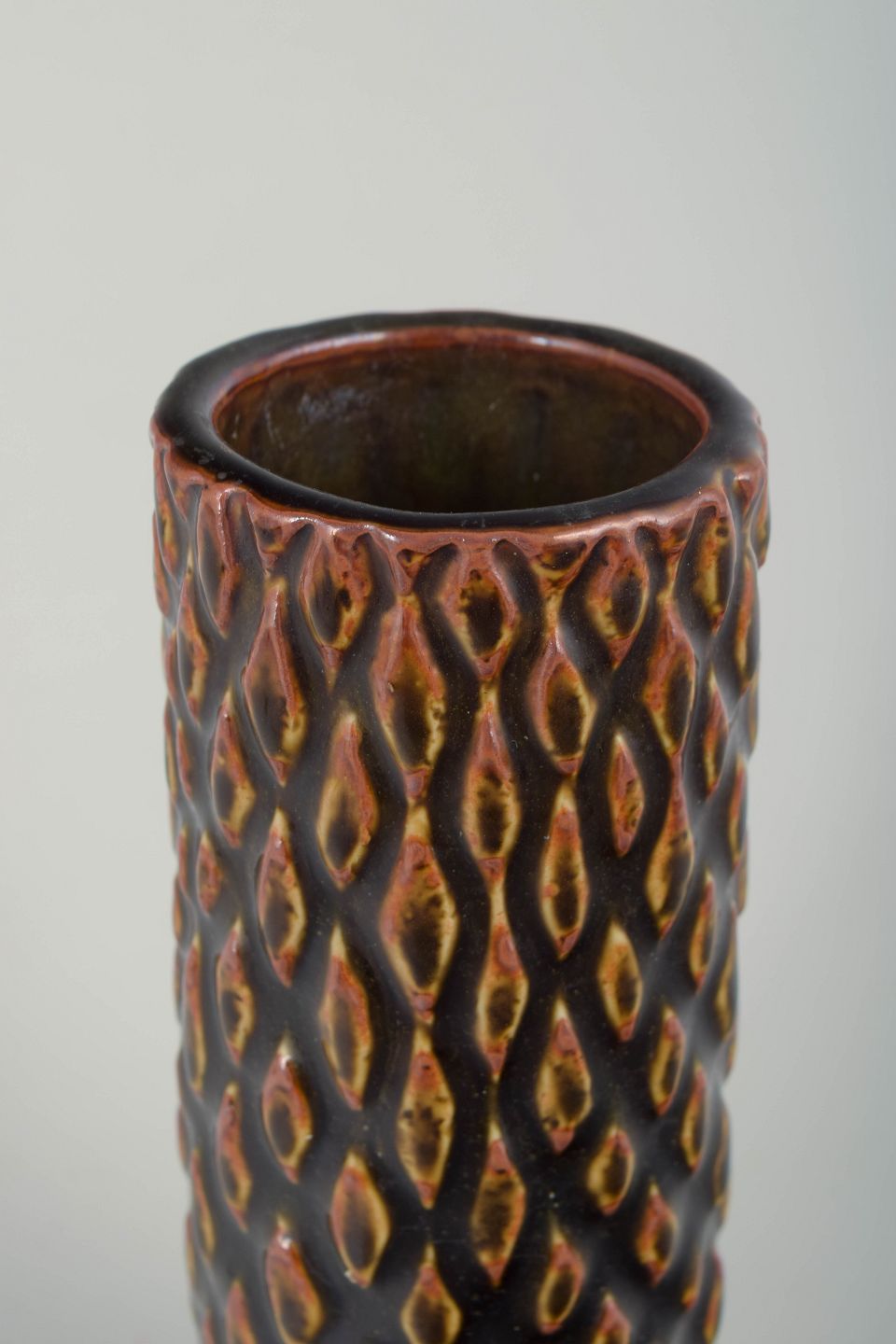 Cylindrisk stentøjsvase i spirende stil med kraftig reliefdekoration i gentaget, organisk diamantmønster. Den spirende stil er én af Saltos karakteristiske stilarter. Overfladen er præget af dyb, mørk glasur med varme rav- og bruntonede gennembrud i relieffet, hvilket skaber et levende spil mellem lys og skygge. Udtrykket ligger tæt på Axel Saltos eksperimenterende Art Deco-arbejder fra 1930’erne, hvor skulpturel form og tekstureret overflade var centrale elementer.