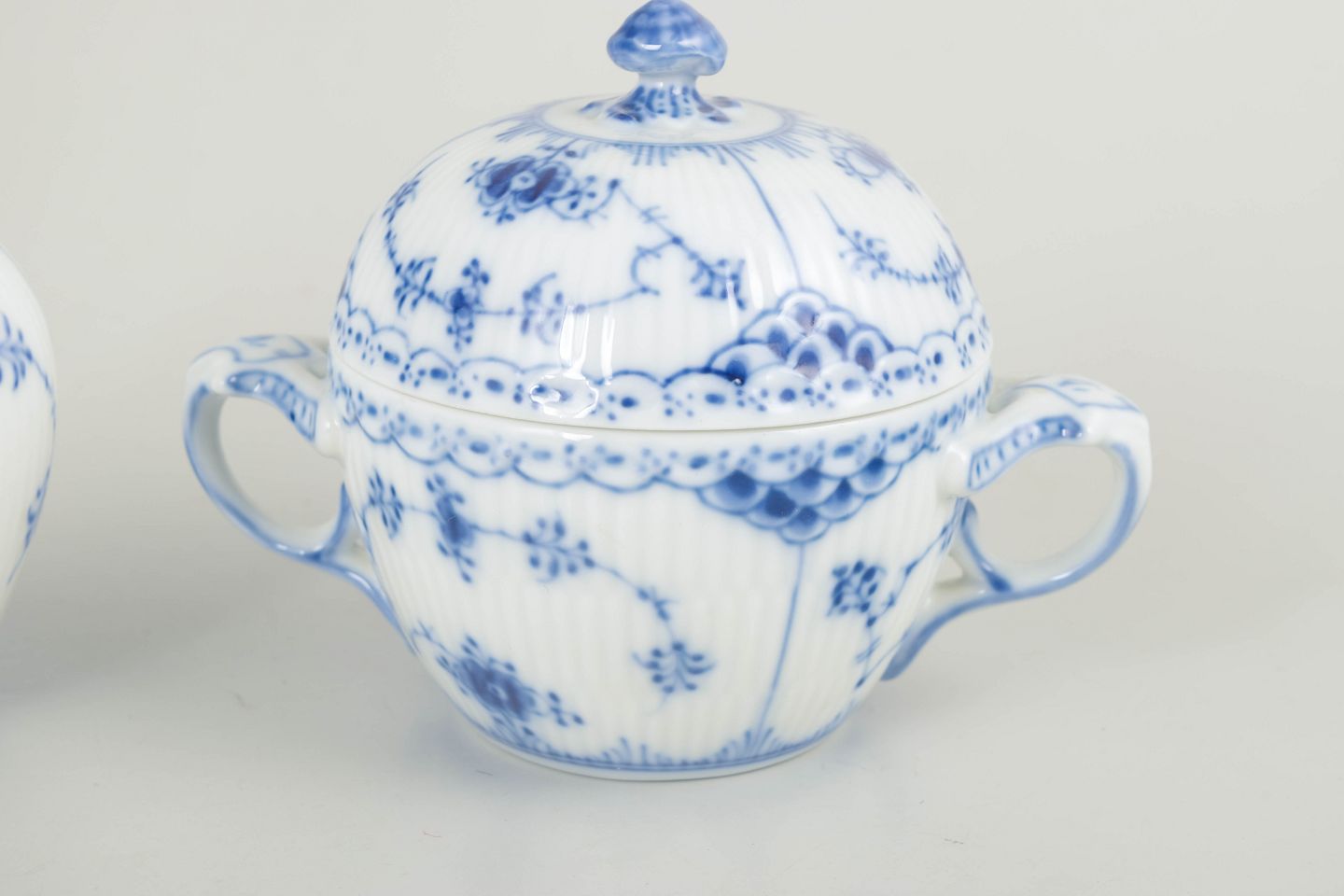 Musselmalet halvblonde blev introduceret i 1885 som en mere dekorativ videreudvikling af det klassiske Blue Fluted Plain stel. De riflede former kombineret med gennembrudt blondekant og håndmalet dekoration har gjort stellet til et af Royal Copenhagens mest elskede gennem generationer. Produktionen i det sene 1900-tal fastholder samme høje håndværksmæssige kvalitet og gør sættet velegnet både til daglig brug og som supplement til ældre dele.