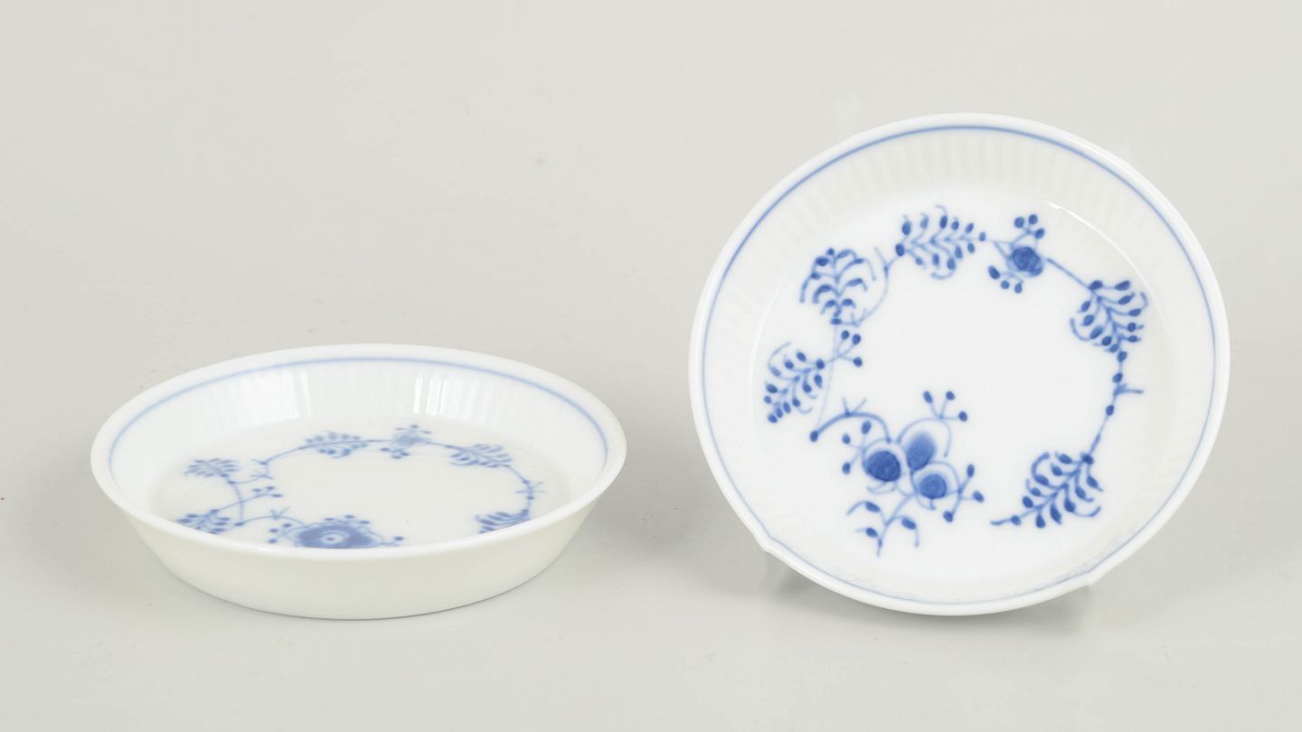 Sæt bestående af to små flaskebakker i Musselmalet Riflet, udført i klassisk riflet form og dekoreret med håndmalet koboltblå underglasur. Bakkerne er beregnet til brug under flasker eller glas og beskytter bordfladen mod dryp, samtidig med at de fungerer som dekorative borddetaljer.