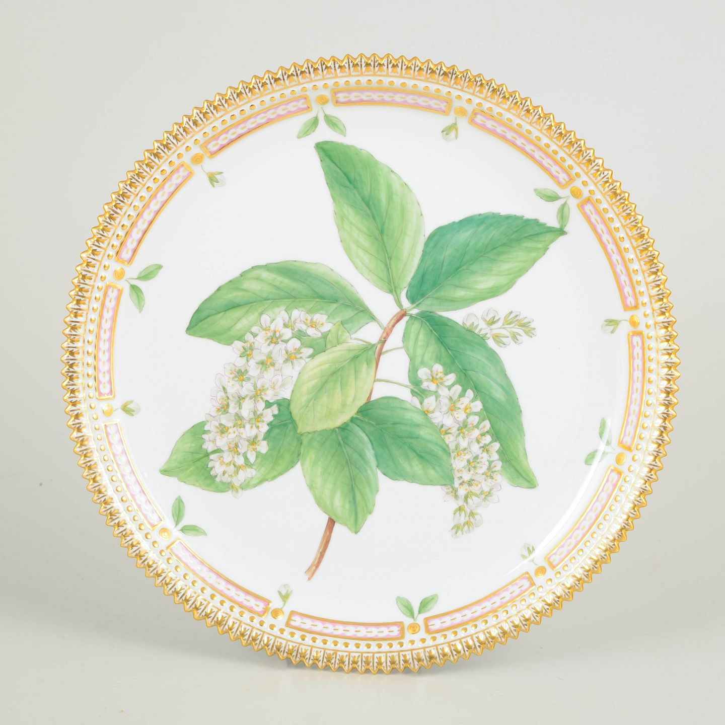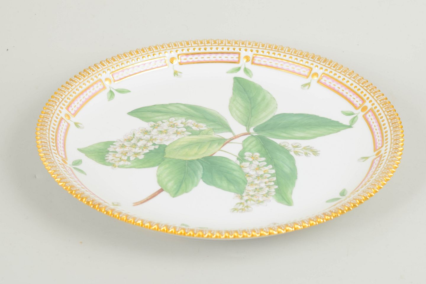 Bio: Flora Danica-stellet blev introduceret i 1790 og regnes blandt Royal Copenhagens mest prestigefyldte produktioner. Dekorationerne er baseret på det monumentale botaniske værk Flora Danica og er kendetegnet ved høj detaljerigdom og fremragende håndværksmæssig kvalitet. Bakker og fade blev anvendt både praktisk og dekorativt ved det forfinede bord og er i dag eftertragtede samlerobjekter.