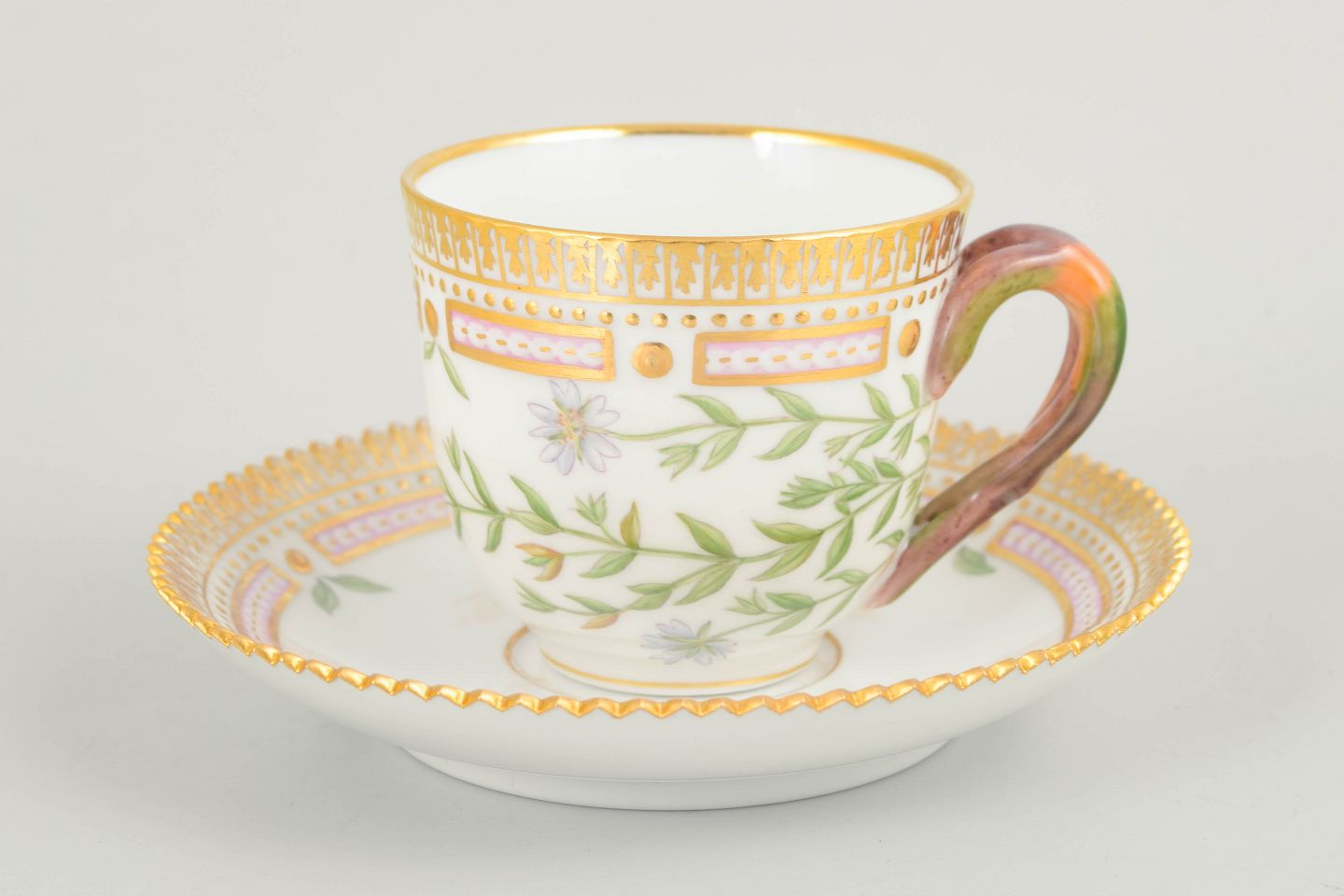 Elegant moccakop med tilhørende underkop i det ikoniske Flora Danica-stel. Koppen er håndmalet med botanisk motiv gengivet efter Flora Danica-værket og udført i stellets karakteristiske, raffinerede formsprog med dekorativ kant. En klassisk og eksklusiv kaffekop.