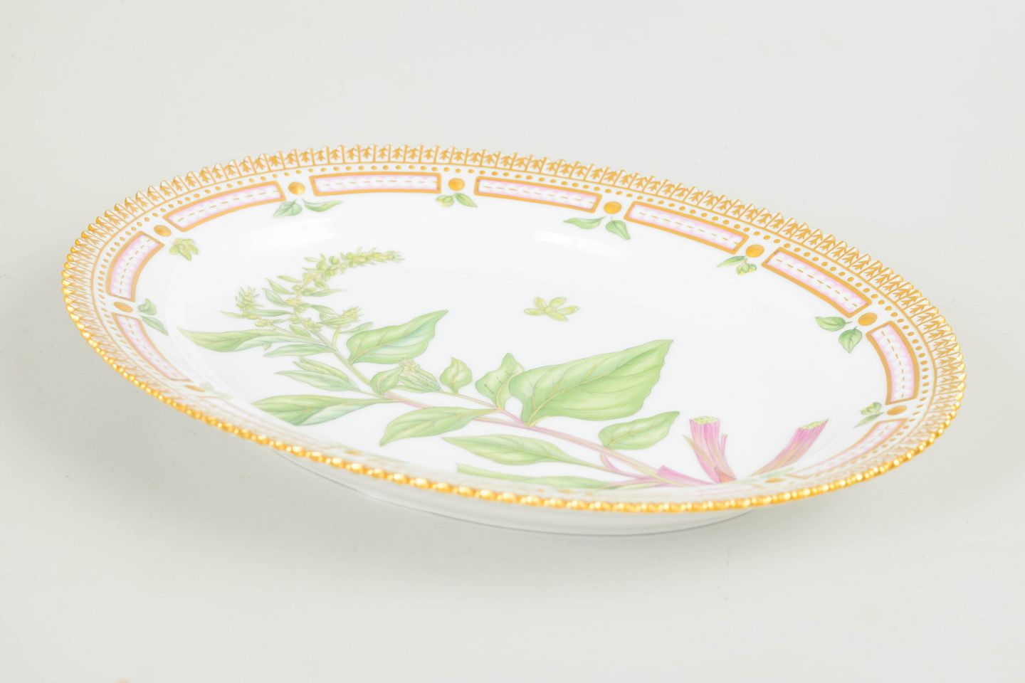 Ovalt serveringsfad i Flora Danica med håndmalet botanisk dekoration efter originale kobberstik fra Flora Danica-værket. Fadet er udført i hvidt porcelæn med fint gennemarbejdet gennembrudt rand, forgyldt kant og detaljer i rosa og guld. En klassisk serveringsform fra Royal Copenhagens sene 1900-tals produktion.