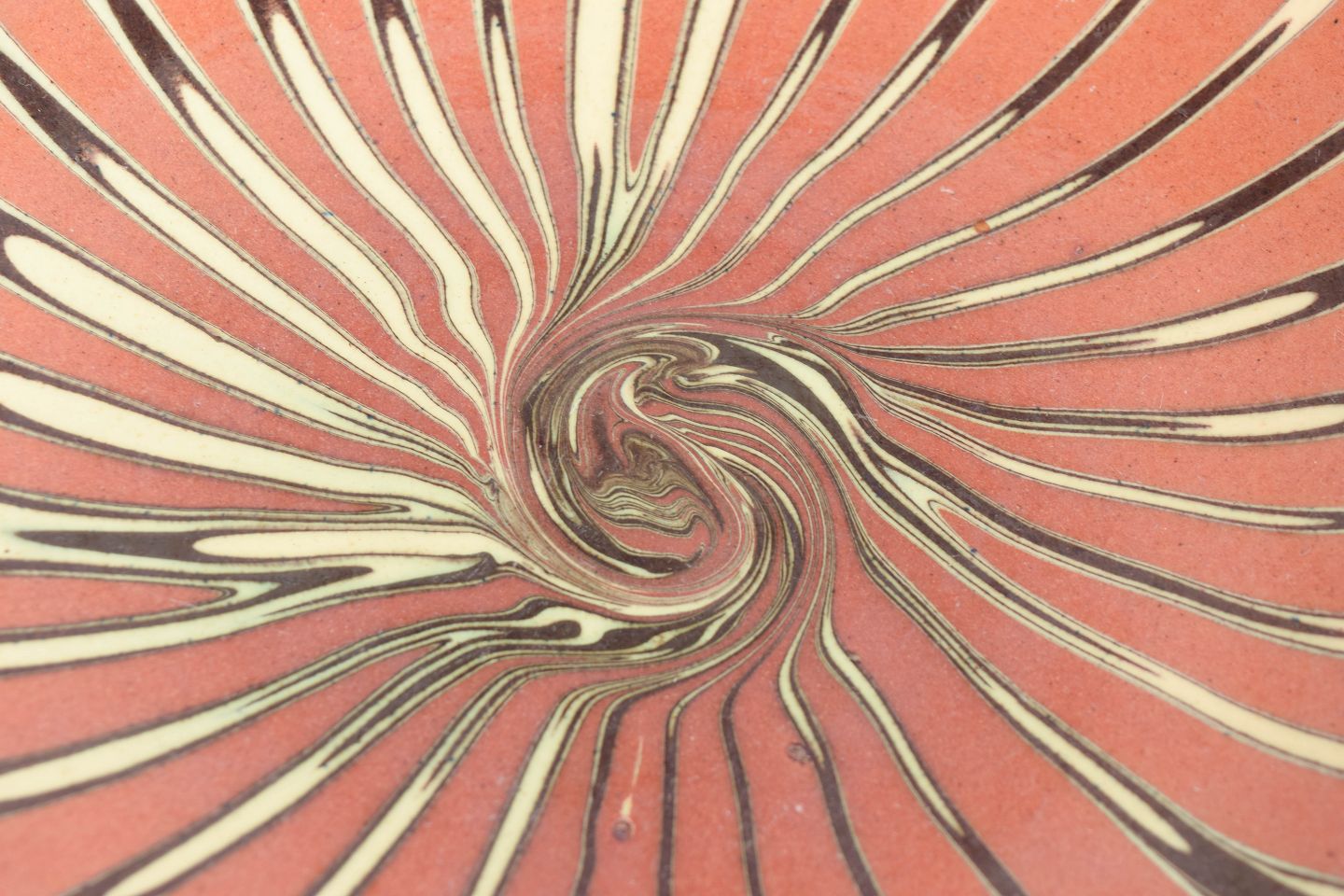 Dekorativ skål i fajance med karakteristisk slynget slipdekoration i rosa, creme og mørke kontrasttoner. Den brede, lavtbuede form fremhæver den dynamiske, spiralformede dekoration, som er typisk for Kählers kunstneriske produktion i mellemkrigstiden. Et fint eksempel på dansk keramikkunst fra 1930’erne.