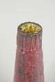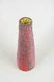 Høj og slank vase udført i stentøj med sjælden og eksperimenterende overfladeteknik, der giver en kraftig, struktureret tekstur. Glasuren fremstår i dybe rødlige nuancer med mørkere partier og tydelig vertikal bevægelse i overfladen. Den smalle hals og markante højde understreger det skulpturelle udtryk.