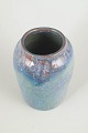 Elegant og balanceret vase udført i stentøj med blank, flerlaget glasur i blålige og grønlige nuancer med mørkere overgange ved halsen. Overfladen har et levende og dybdevirkende udtryk, karakteristisk for tidens eksperimenterende glasurteknikker.