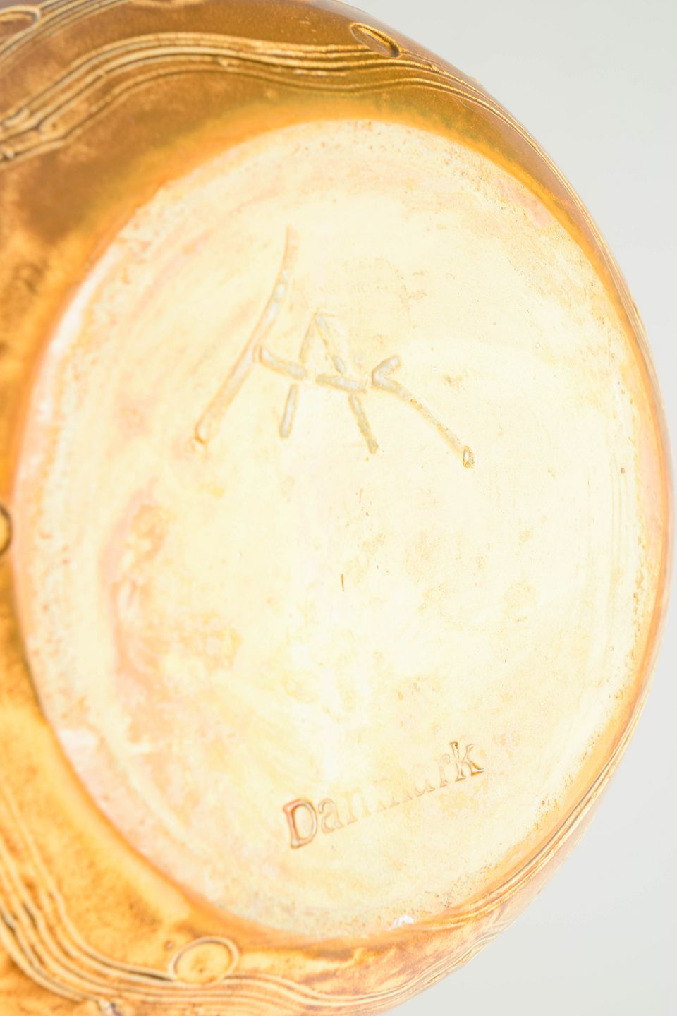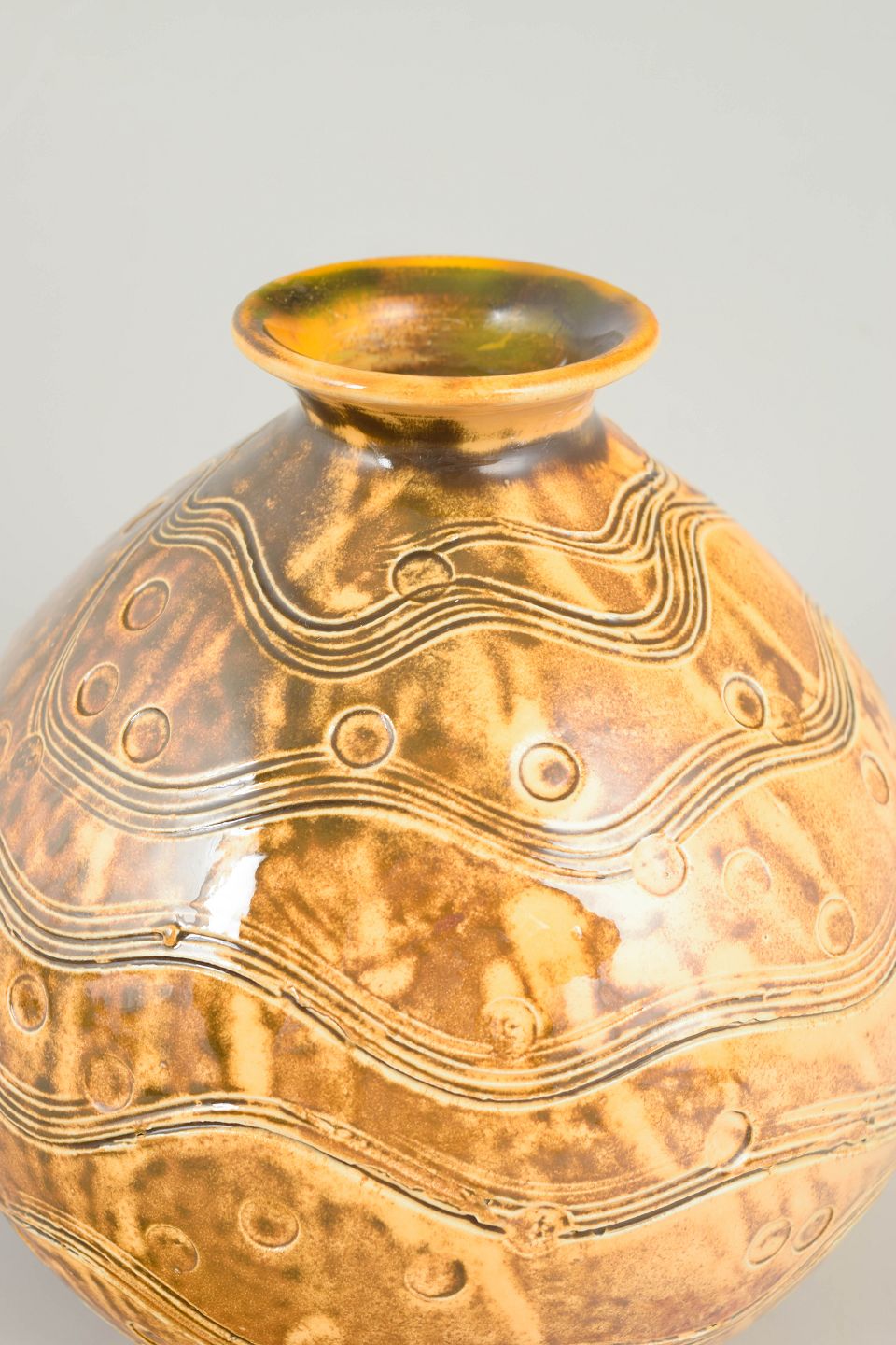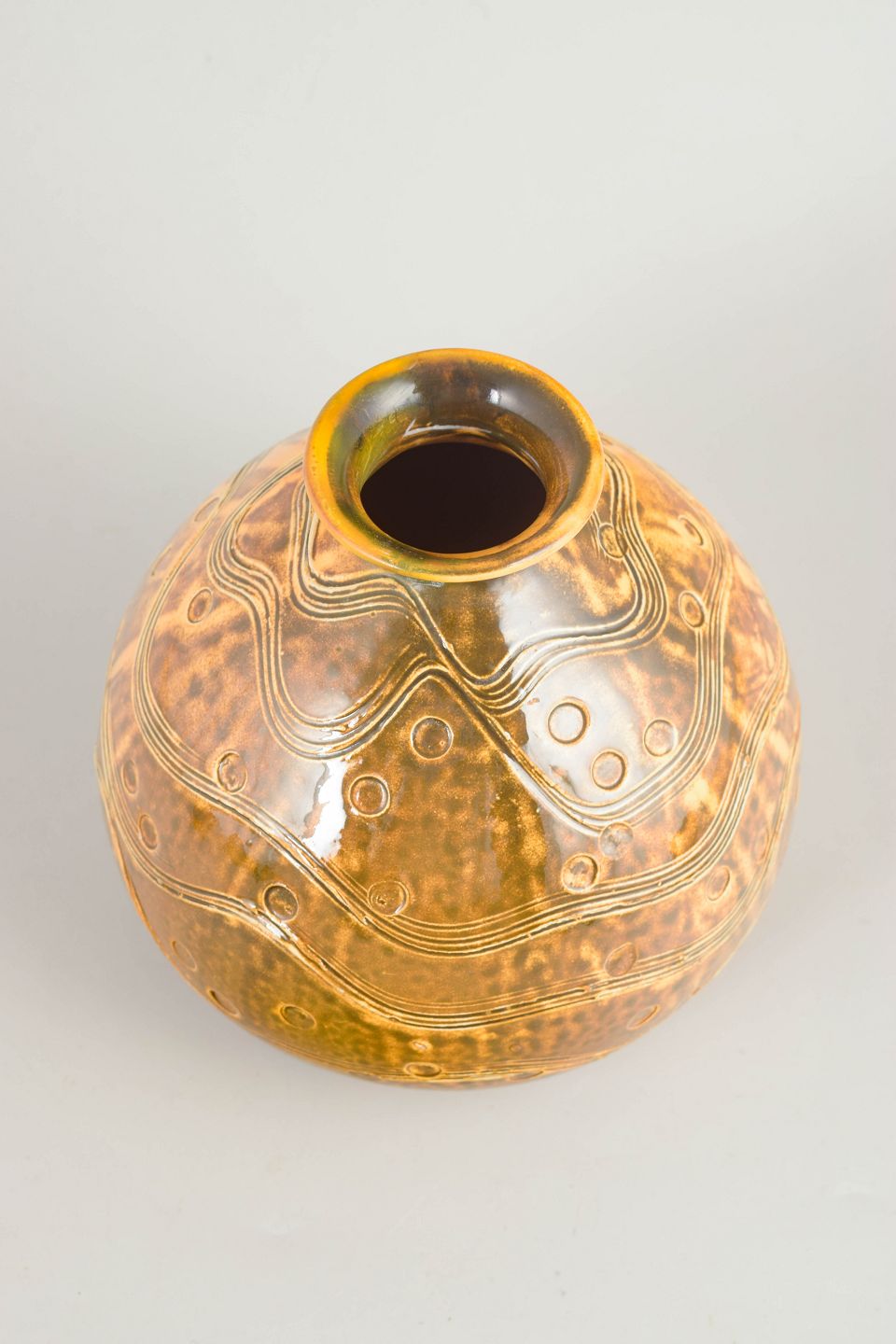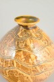 Kugleformet keramikvase fra Kähler, udført i drejet stentøj med indridset bølgeornamentik og cirkulære detaljer. Vasen er dækket af en varm, gyldenbrun glasur med smukt spil og dybde, karakteristisk for Kählers dekorative produktion i perioden. Den bløde, afrundede form kombineret med den taktile overflade giver vasen et markant, men harmonisk udtryk.