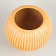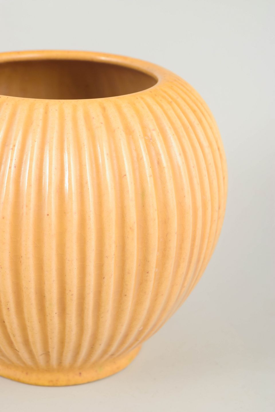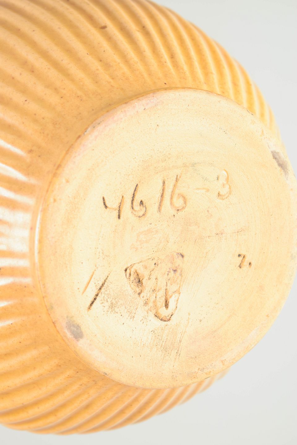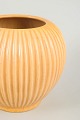 Skulpturel vase i drejet stentøj med markant lodret riflet korpus og afrundet, balusterformet silhuet. Den matte okker- til sandfarvede glasur understreger formens stringente, geometriske udtryk, karakteristisk for nordisk Art Deco og tidlig modernisme. Modellen er markeret 4616-3.