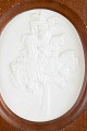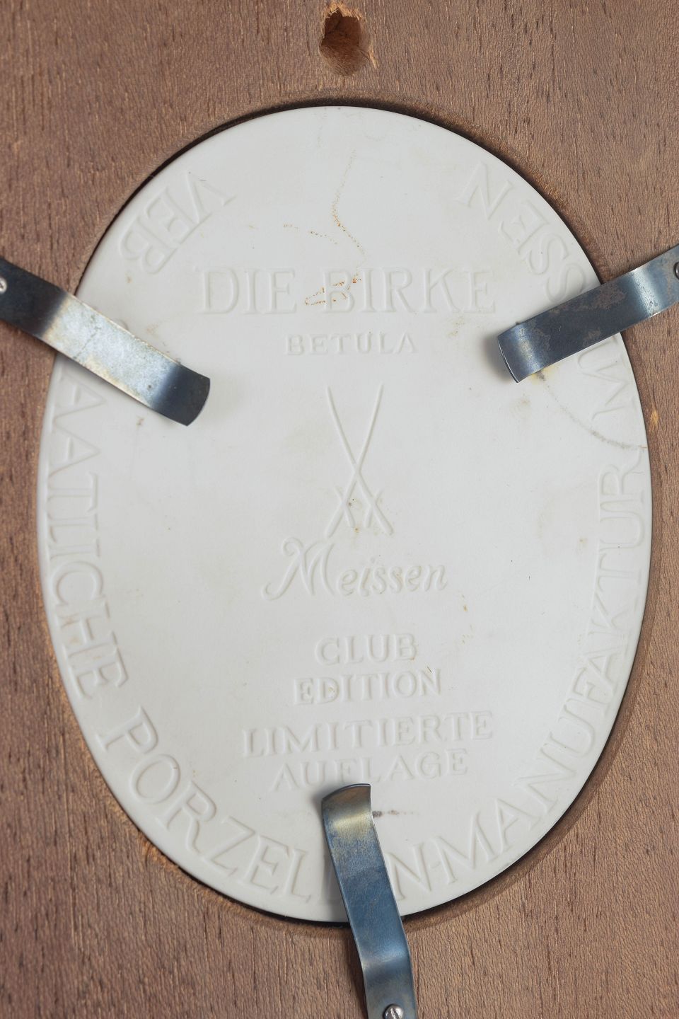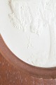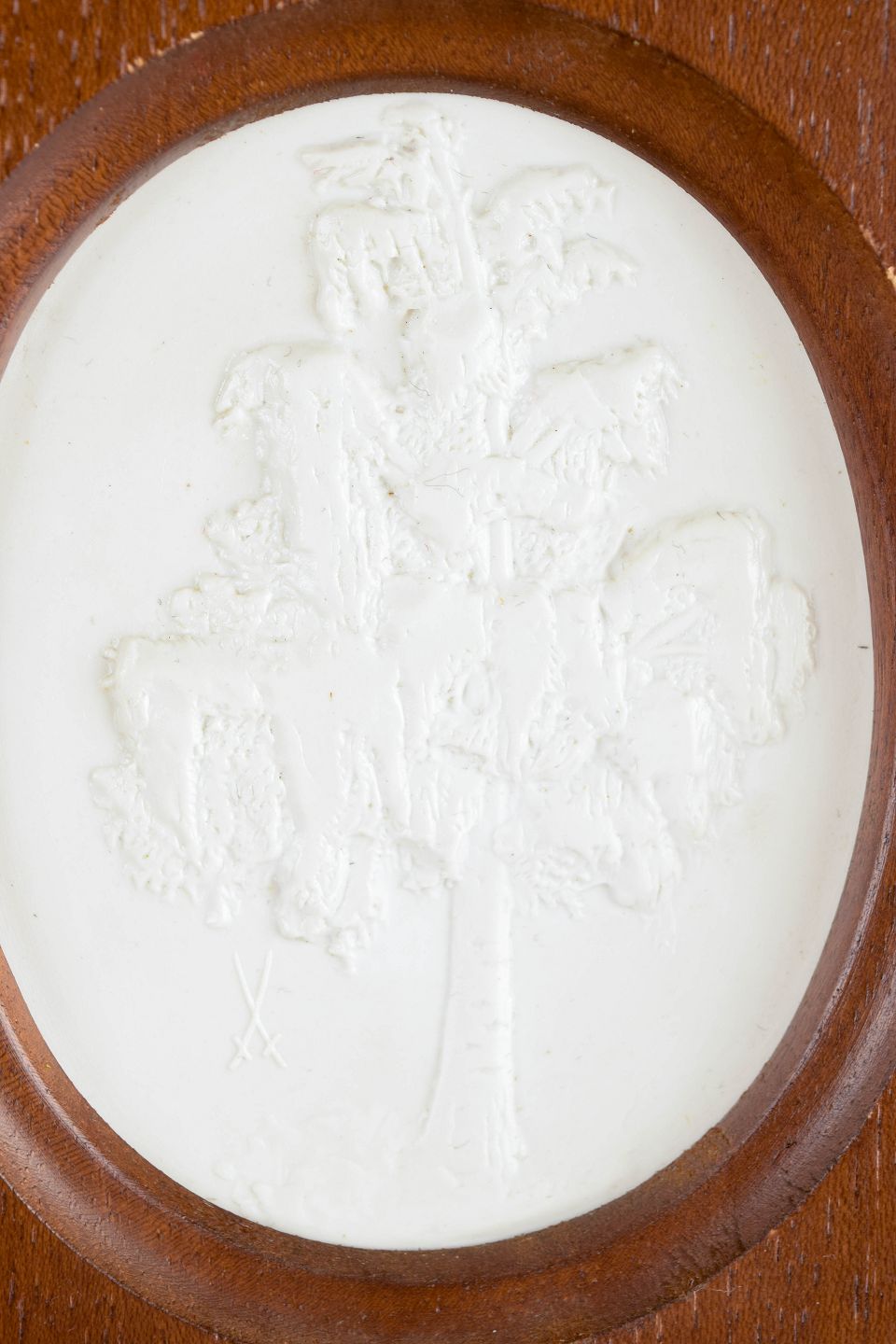 Reliefplakette i hvid biscuit porcelæn med naturalistisk træmotiv, monteret i rektangulær træramme med ovalt udsnit. Den matte biscuit overflade fremhæver relieffets fine detaljer og giver et roligt, klassisk udtryk.