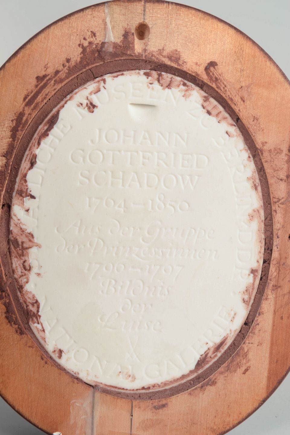 Oval reliefplakette i hvid biscuit porcelæn med klassisk profilportræt af kvinde, monteret i profileret oval træramme. Den matte biscuit overflade giver motivet et skulpturelt, kamee lignende udtryk med fine, bløde detaljer.