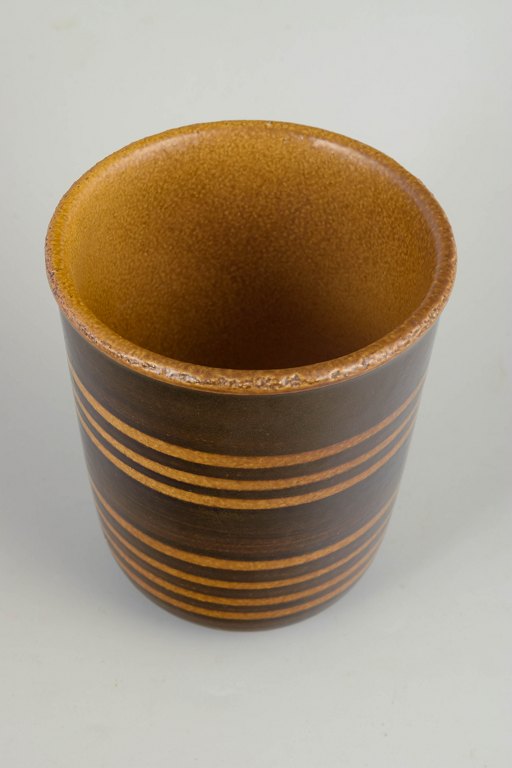 Decorative faience vase with hand-painted, stylised decoration, characteristic of Britt-Louise Sundell’s work for Gustavsberg during the 1960s. The form is restrained and well balanced, with an emphasis on surface decoration and colour typical of Swedish mid-century modern design.