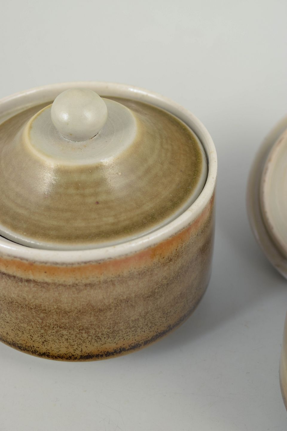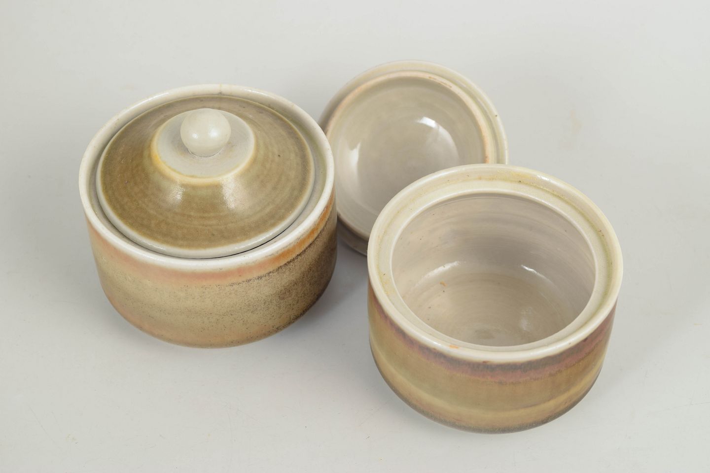 Par drejede lågkrukker i stentøj med cylindrisk form og tilpassede låg med knop. Udført med afdæmpede, naturlige glasurer i sand, brunlige og let violette nuancer med horisontalt glasurspil og lys kant. Signerede i bunden og produceret hos Höganäs i 1970’erne.