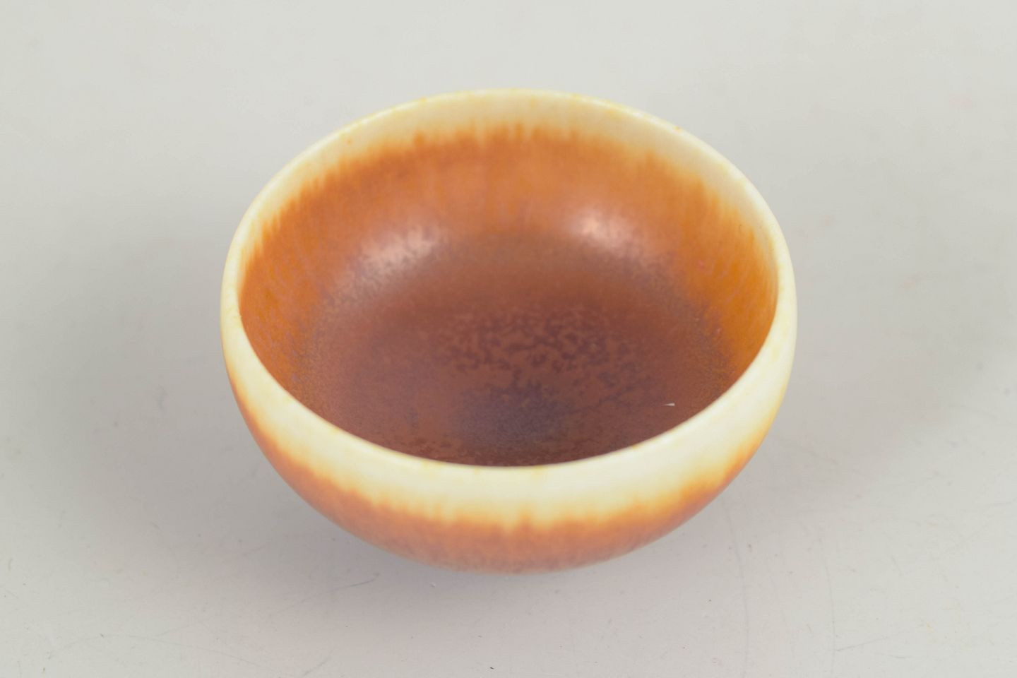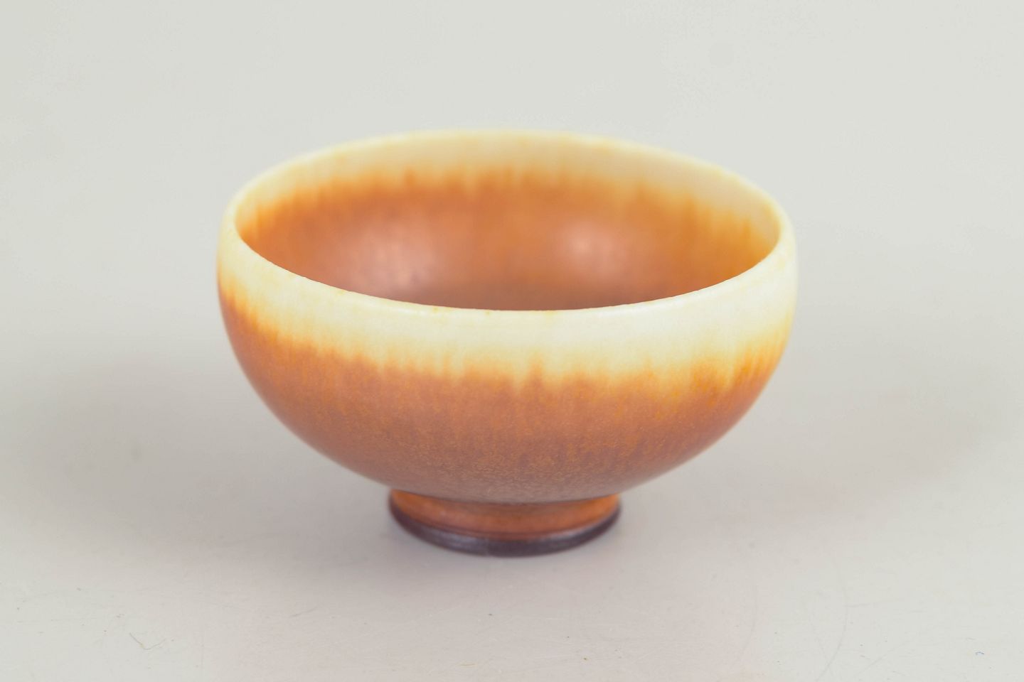 Miniature bowl in thrown stoneware with a finely balanced form and a characteristic glaze in warm brown and cream tones. A small yet highly refined object executed with exceptional precision, typical of Berndt Friberg’s work from the mid-20th century.