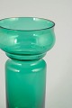 Elegant vase i klart turkisgrønt glas med balanceret, skulpturel profil og blød, rundet form. Mundblæst udførelse med markeret skålformet overdel og cylindrisk underdel, typisk for finsk kunstglas fra 1970’erne.