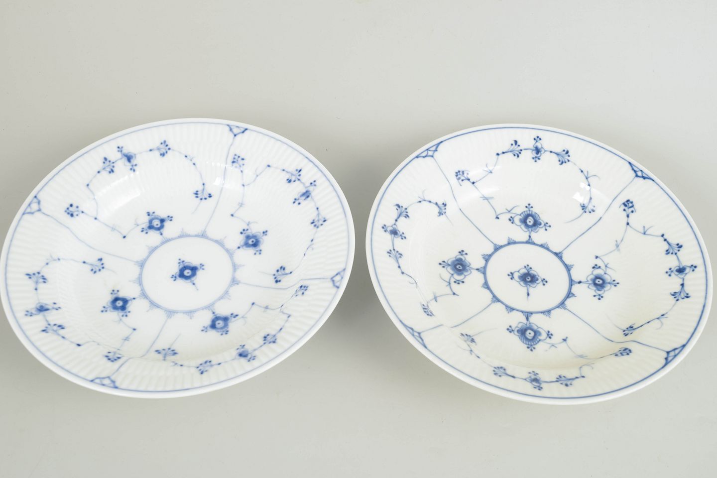 To dybe tallerkener i håndmalet porcelæn med klassisk Musselmalet dekoration i underglasurblå. Det karakteristiske riflede porcelæn og det detaljerede blomster- og rankemotiv er udført i traditionel stil, som kendetegner Bing & Grøndahls produktion fra slutningen af 1800-tallet. Formen og dekorationen følger det historiske Musselmalet-mønster.