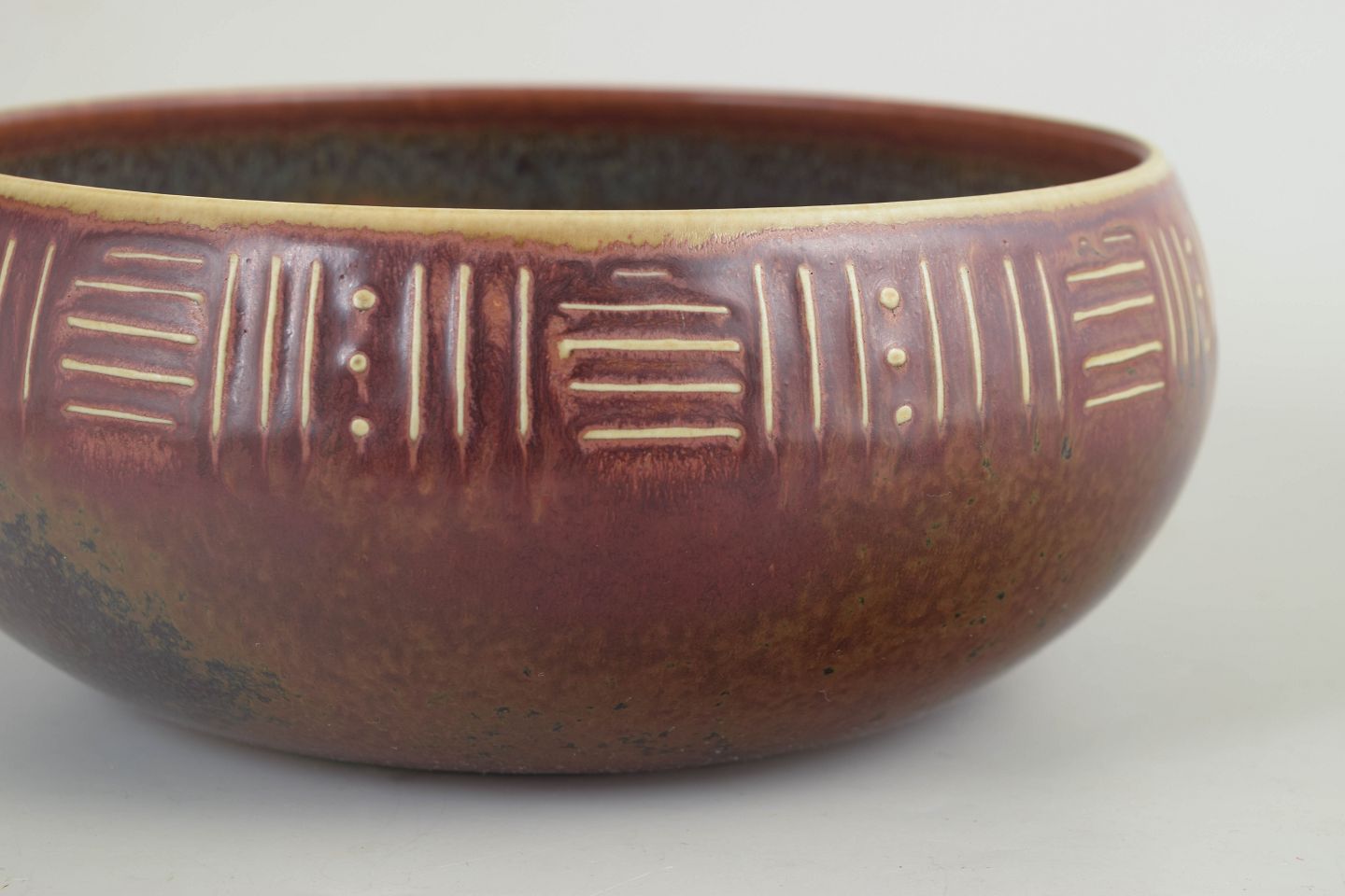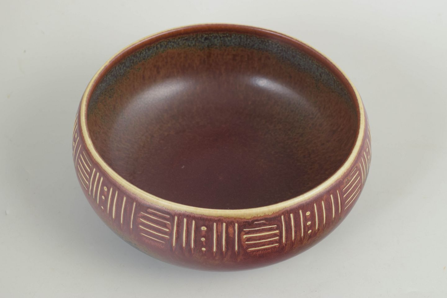 Unique, hand-thrown stoneware bowl with a low, rounded profile. Finished in a warm reddish-brown glaze with a darker interior and decorated with incised, rhythmic linear motifs, characteristic of Carl-Harry Stålhane’s experimental studio work at Rörstrand in the late 1950s. A strong, tactile piece with pronounced graphic surface treatment.