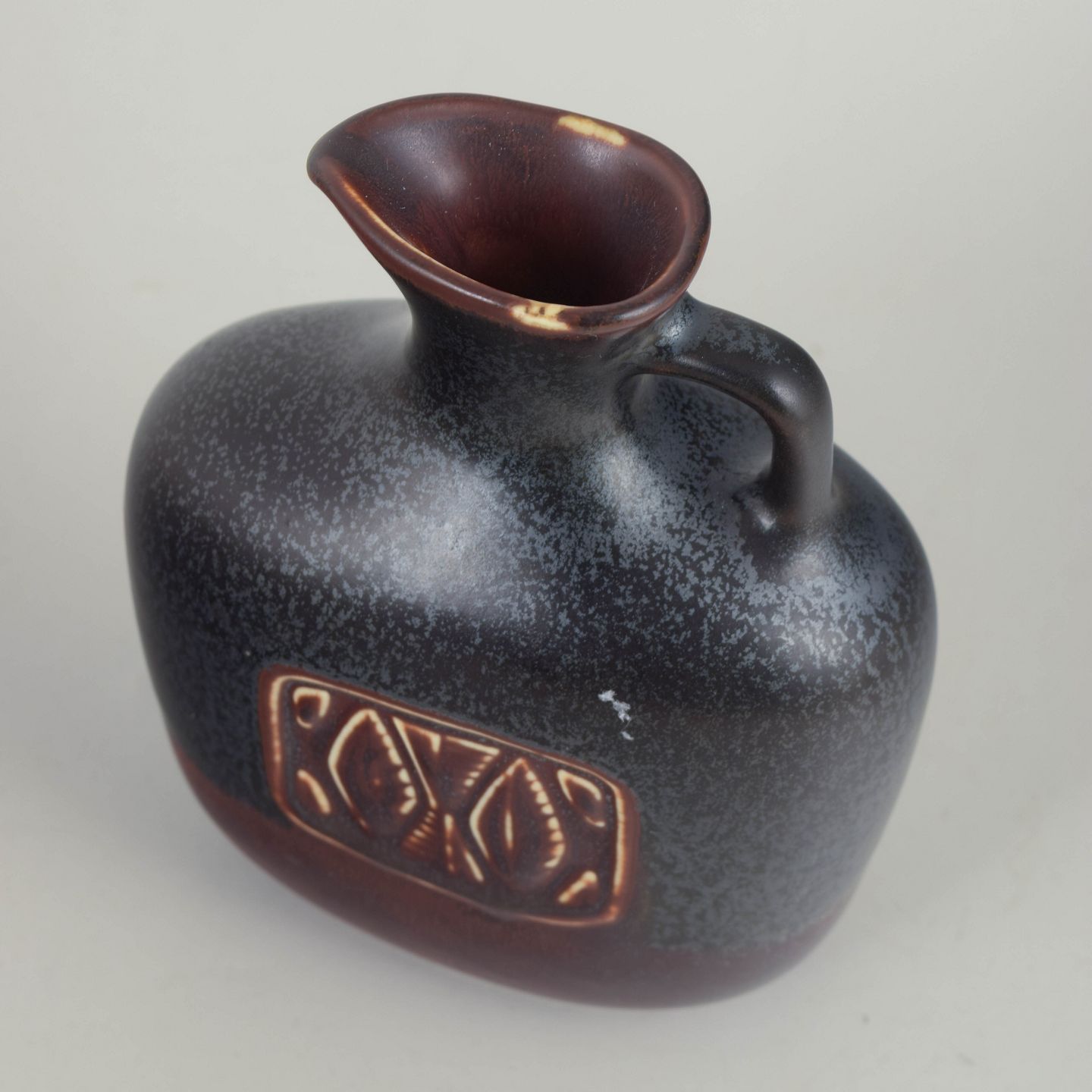Kompakt og velafbalanceret kande i stentøj med afrundet, skulpturel form. Udført med karakteristisk mørk, fint spættet glasur i grålige og brunrøde nuancer, med integreret hank og let udadbøjet hældetud. Et klassisk eksempel på Gunnar Nylunds sikre proportionering og materialefølelse hos Rörstrand i midten af det 20. århundrede.