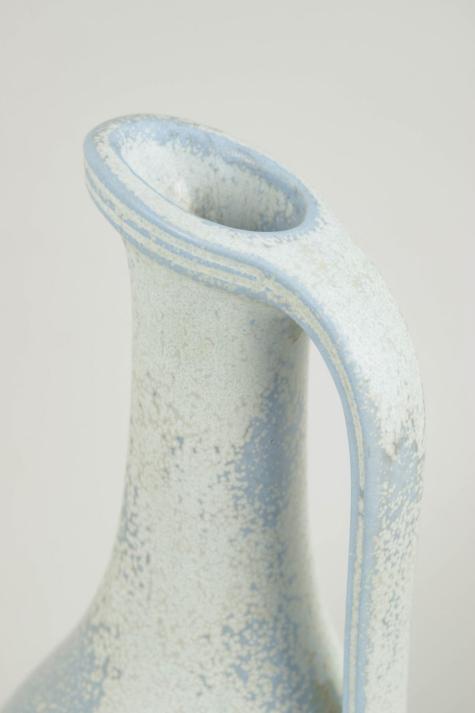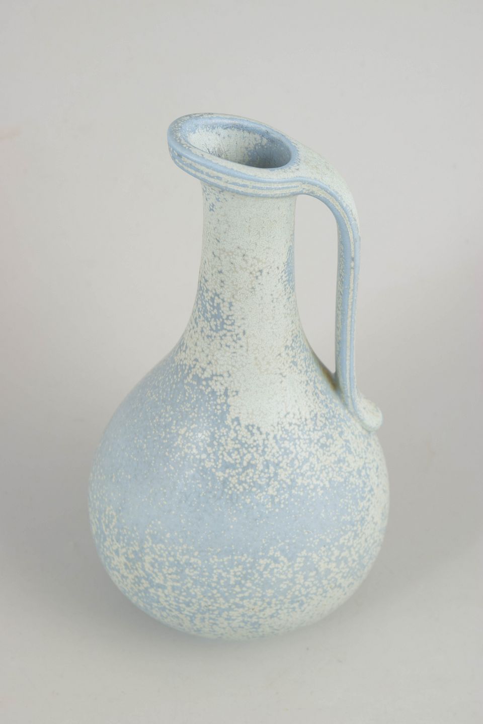 Elegant og balanceret kande i stentøj med blød, organisk form. Udført med karakteristisk lys, spættet glasur i kølige blålige og cremefarvede nuancer, typisk for Gunnar Nylunds produktion hos Rörstrand i midten af det 20. århundrede. Harmonisk proportioneret med integreret hank og let udadbøjet hældetud.