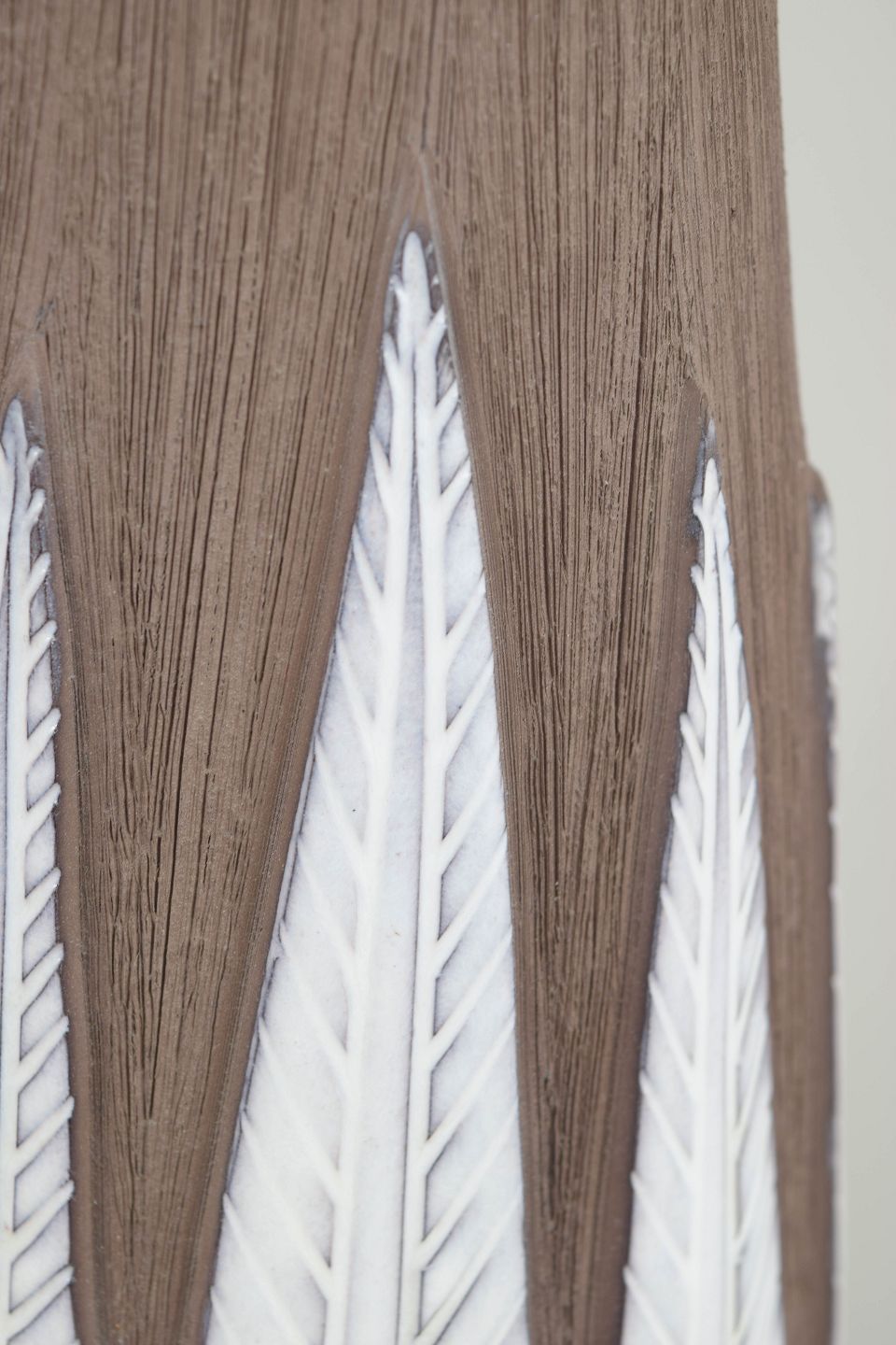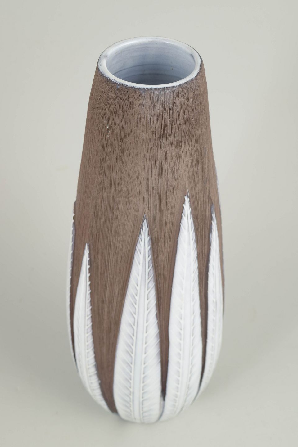 Elegant stoneware vase with characteristic relief decoration inspired by paprika-shaped leaves, executed in contrasting earthy and light-toned glazes. An iconic design closely associated with Swedish mid-century ceramics.