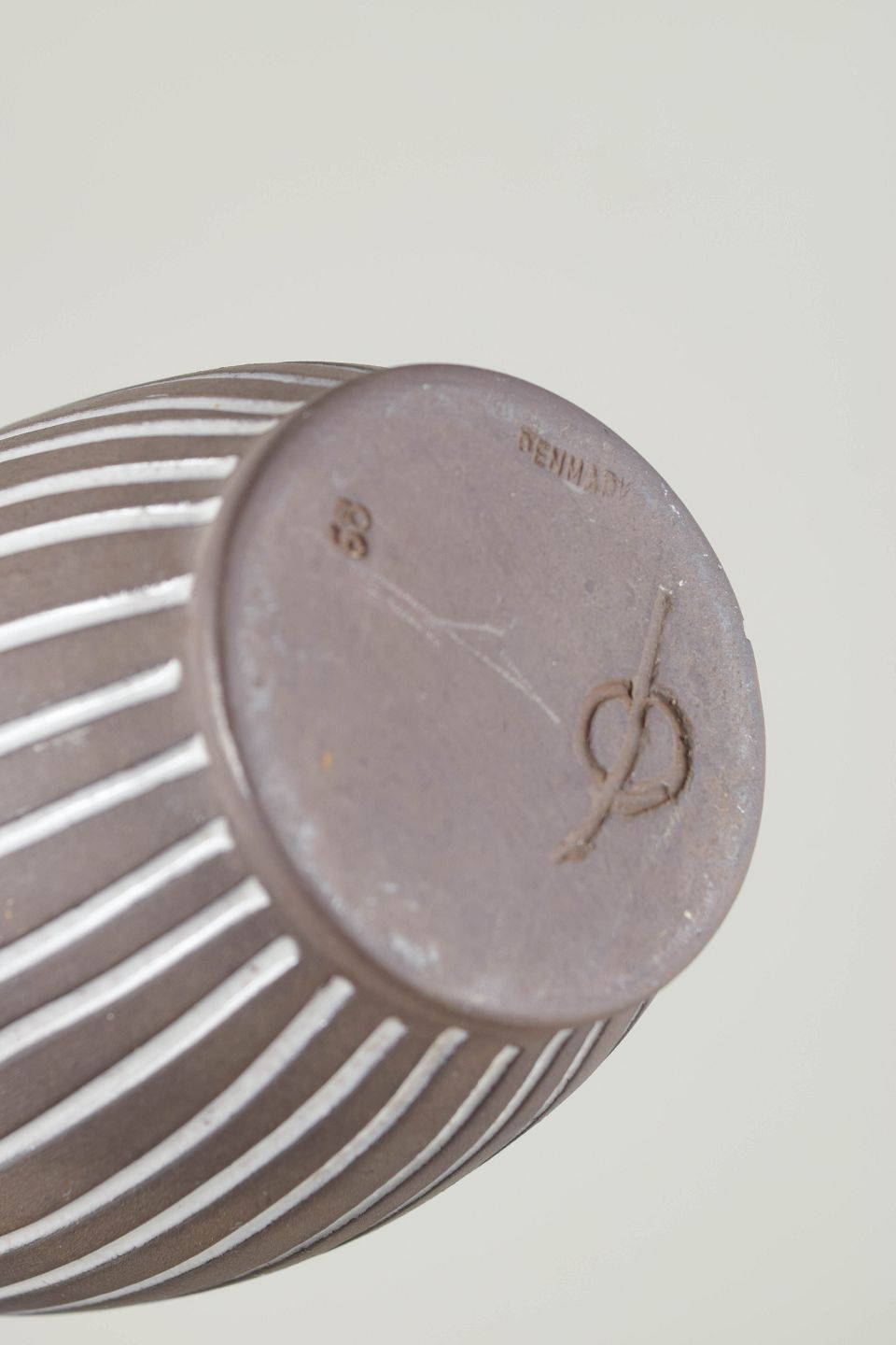 Helge Østerberg (1901–1983) var en markant dansk keramiker med fokus på hånddrejede former og stram, grafisk dekor. Hans arbejder kombinerer klassisk funktionalisme med en tydelig kunstnerisk signatur, ofte udført i jordfarvede glasurer og enkle kontrastmønstre som her. Østerbergs keramik er i dag eftertragtet blandt samlere af nordisk modernisme.