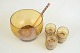 Dimensioner: Skål H. 16 cm, D. 20 cm. Glas H. 6 cm, D. 7 cm. Ske L. 28 cm, B. 7 cm.