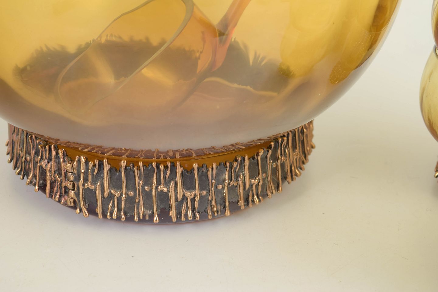 Punchbowlesæt i ravfarvet mundblæst kunstglas med karakteristisk metalfod, bestående af stor punchbowle, 6 glas og tilhørende ske. Det skulpturelle design er kendetegnet ved kontrasten mellem det varme glas og den rå, teksturerede metalfod.