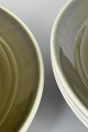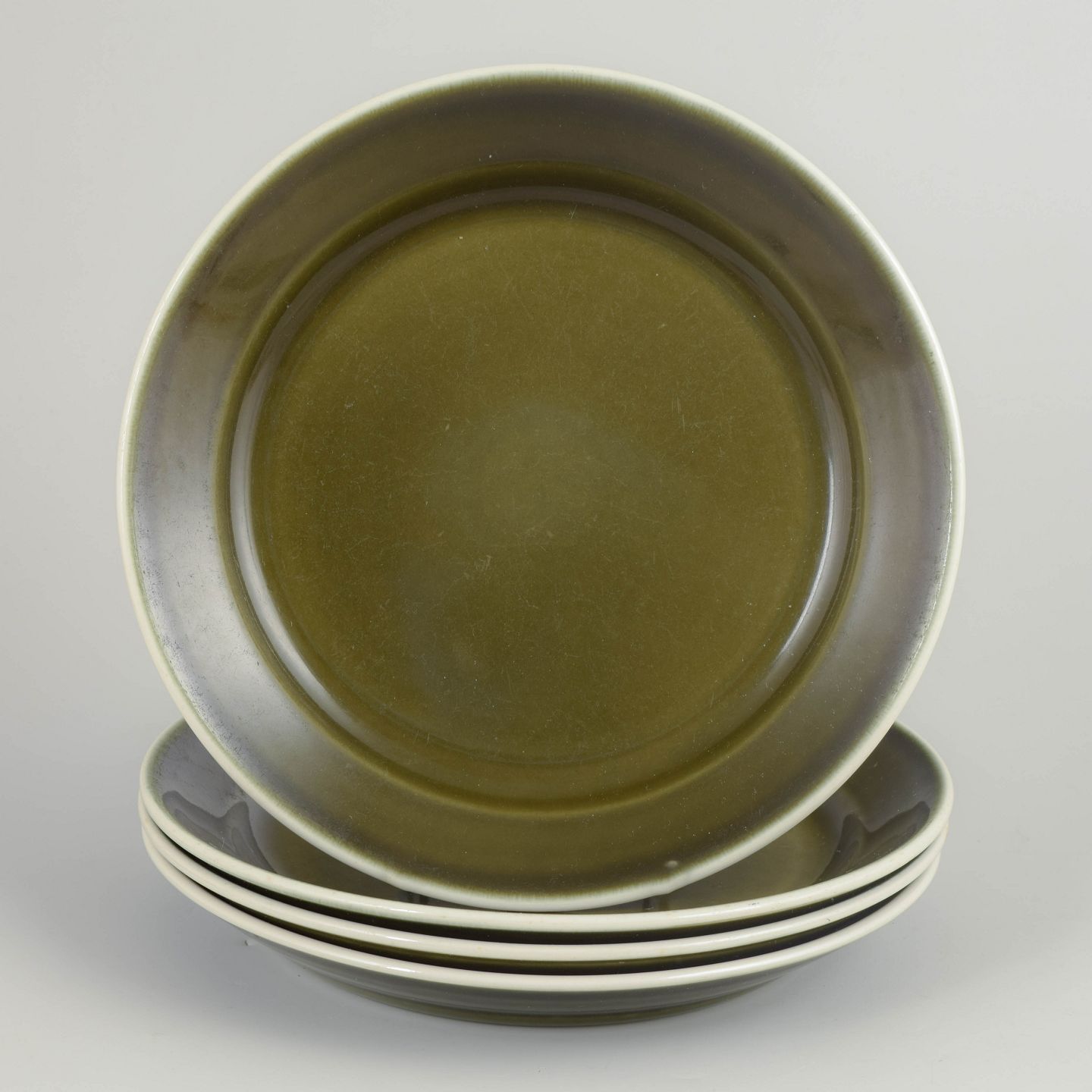 Set of four dinner plates in glazed stoneware from the "Vardag" series. The plates feature a simple, functional design with a wide rim and deep centre, finished in a characteristic green glaze with dark edging, typical of Stig Lindberg’s everyday tableware from the 1970s.