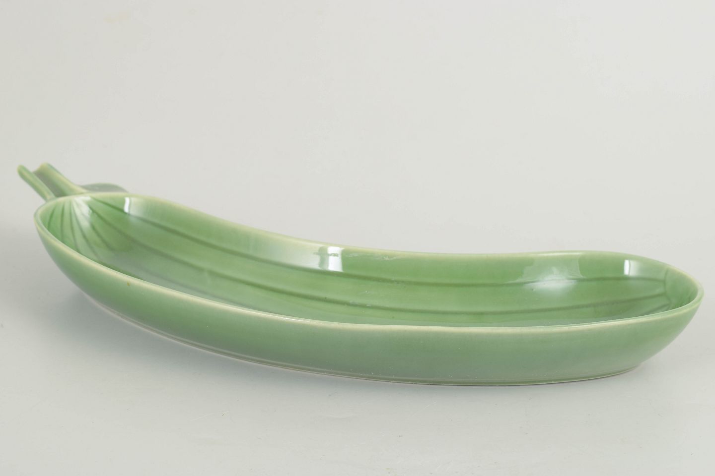 Elongated, naturalistically shaped faience dish modelled as a cucumber, with pronounced ribbing and a glossy green glaze in subtly varied tones. A distinctive and playful design from Stig Lindberg’s later production at Gustavsberg, produced in the 1970s. The model is known as “Cucumber”.