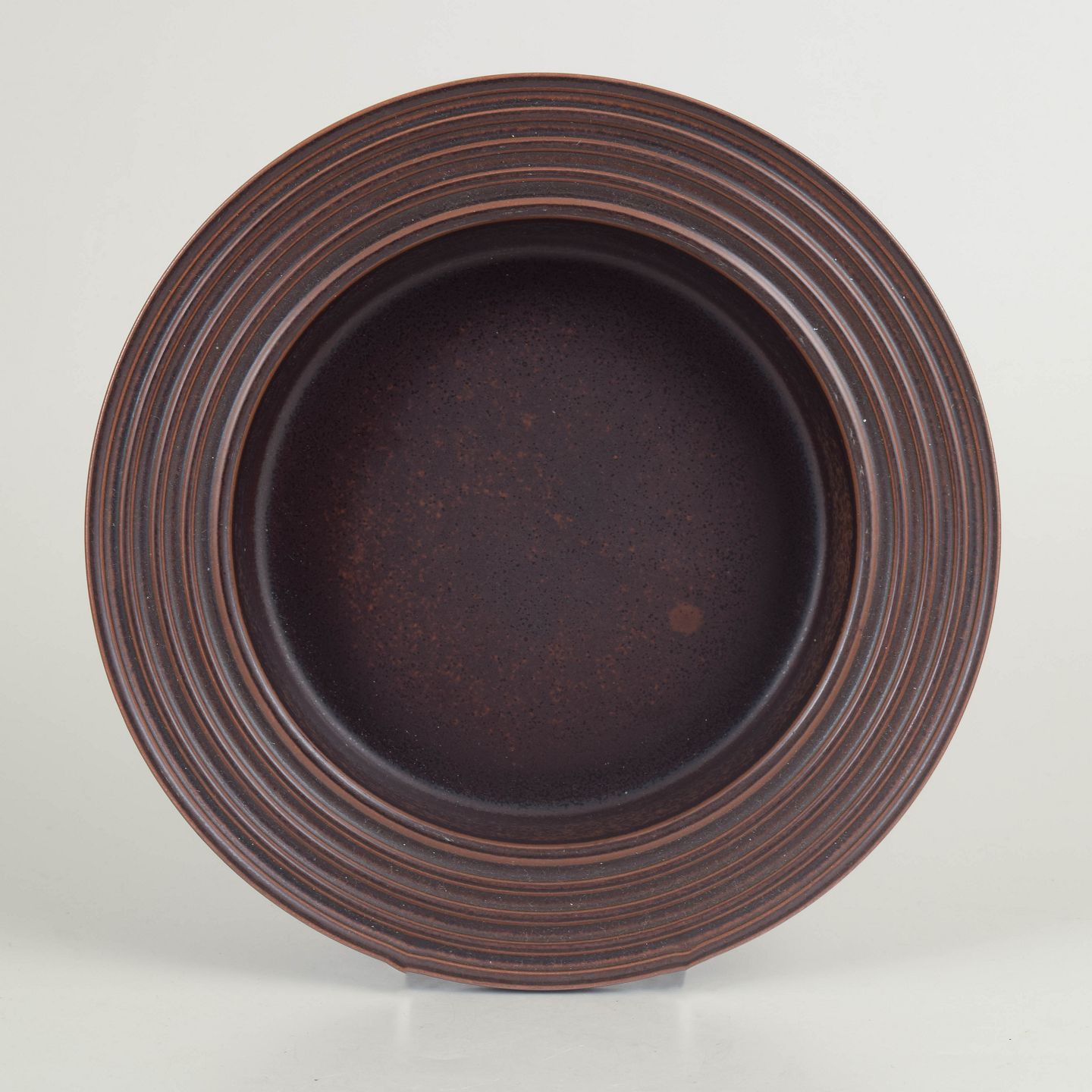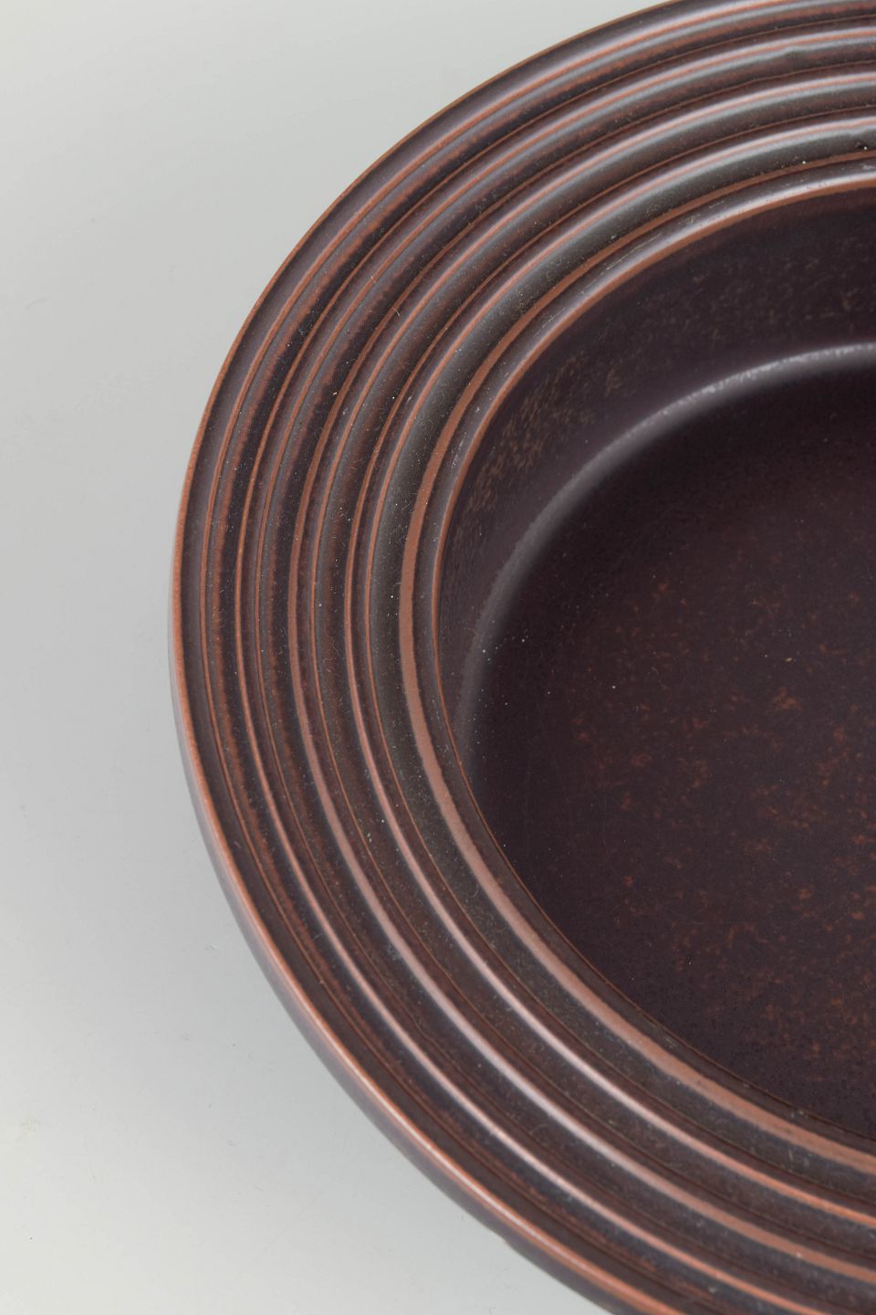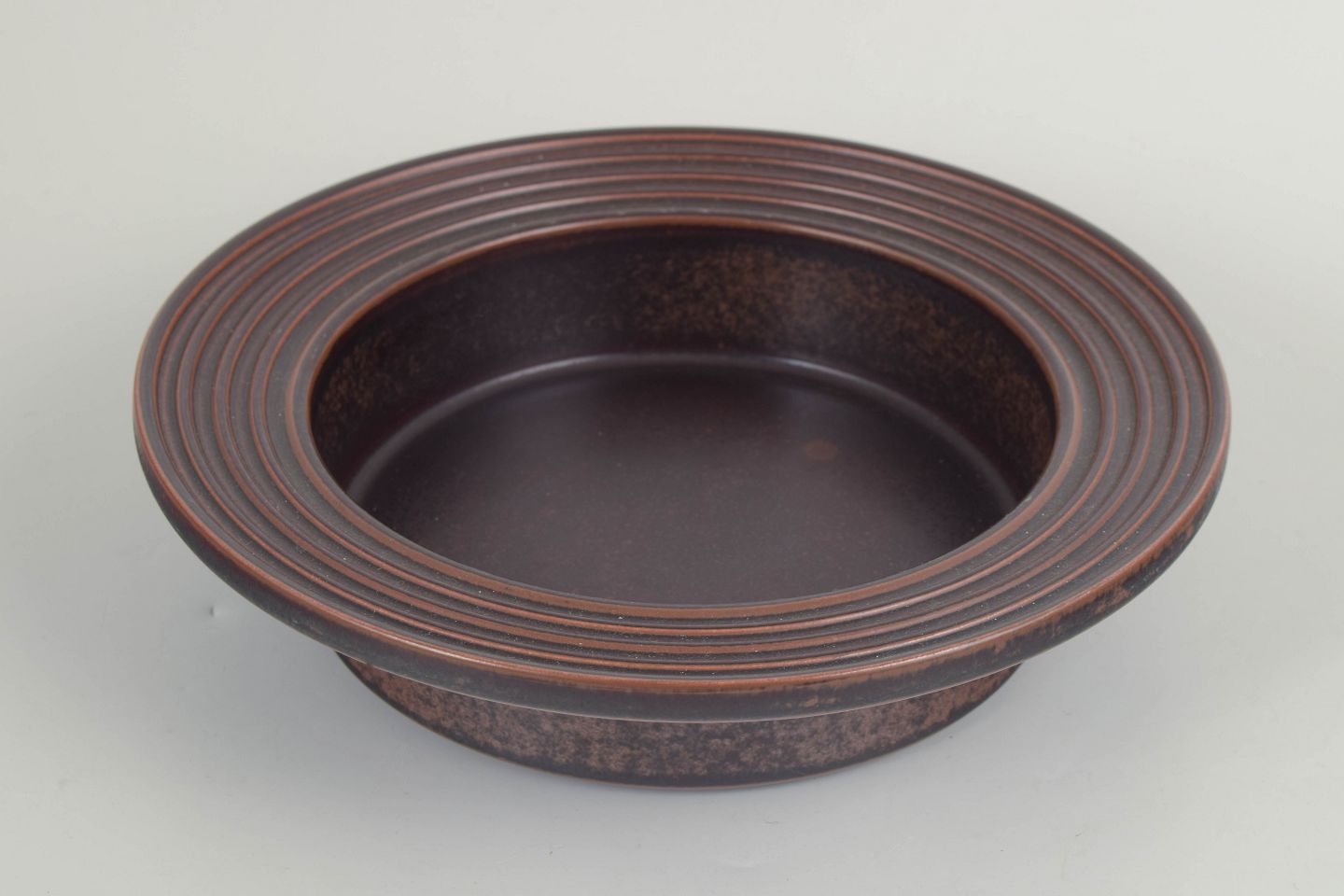 Stor skål i stentøj fra Ruska-serien hos Arabia, udført med karakteristisk, meleret mørkebrun glasur i varme jordtoner. Åben, rund form med bred, profileret fane og dyb kumme, velegnet til servering. Glasuren varierer naturligt og giver skålen et individuelt udtryk.