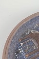 Sjældent, meget stort rundt fad i glaseret stentøj med karakteristisk dekor i blå og jordfarvede nuancer, udført med stiliserede elge i et grafisk, 1970’er-præget formsprog. Overfladen har et levende, spættet glasurudtryk, der fremhæver motivets kontrast og dybde.