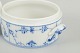 Rillet sukkerskål i glaseret porcelæn med håndmalet underglasurdekoration i koboltblå. Rund, lav form med to integrerede hanke samt låg afsluttet med knop. Model 1/400.